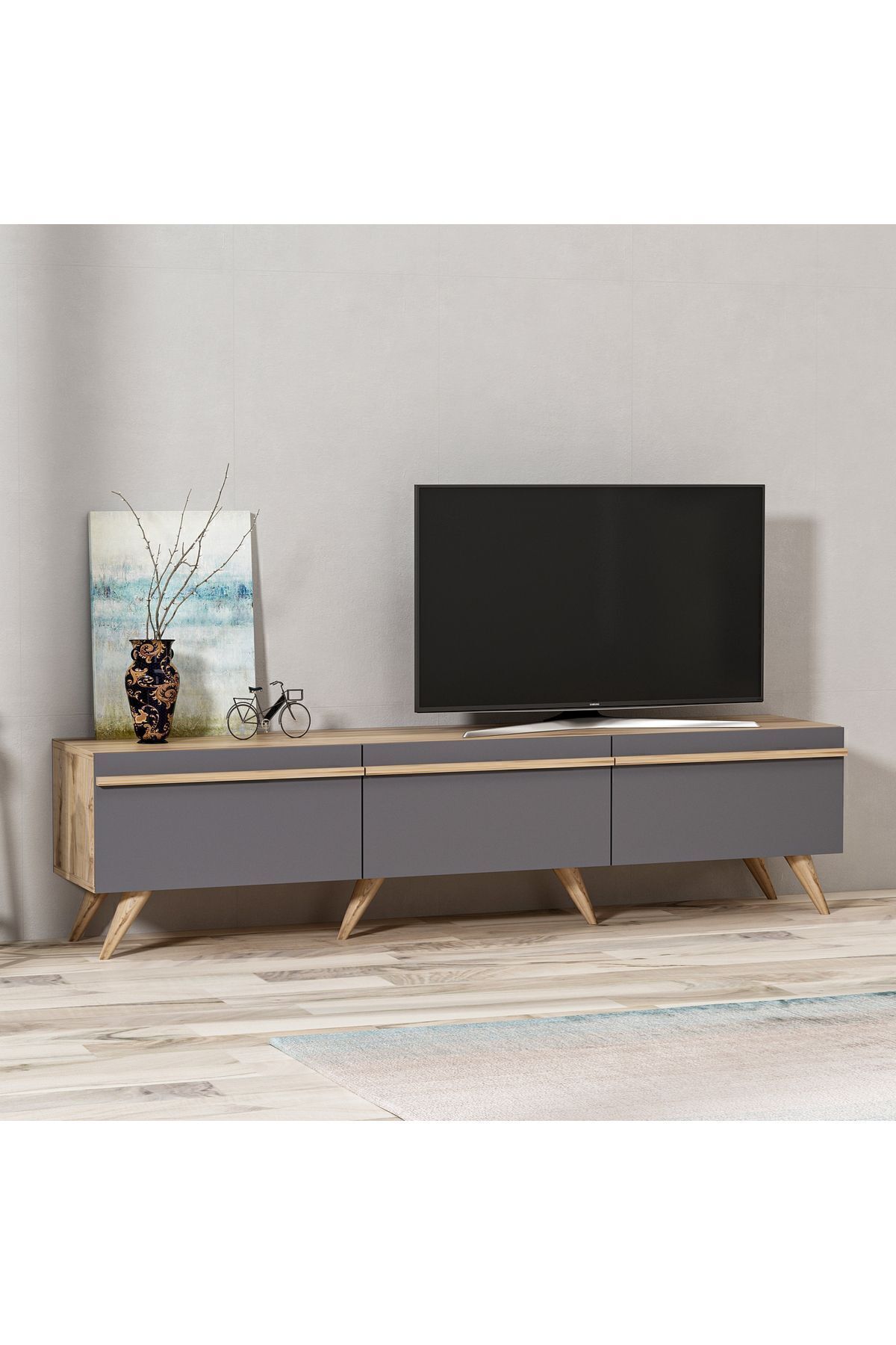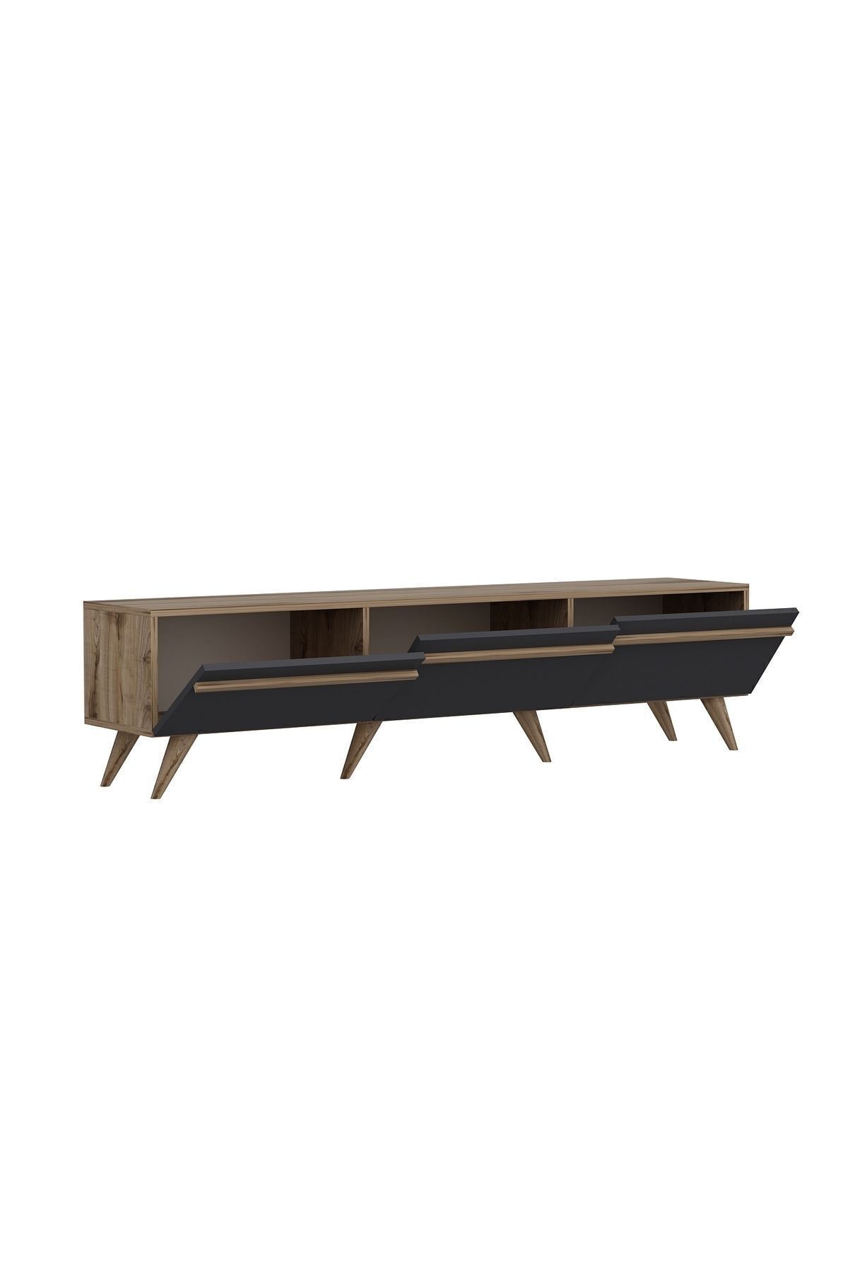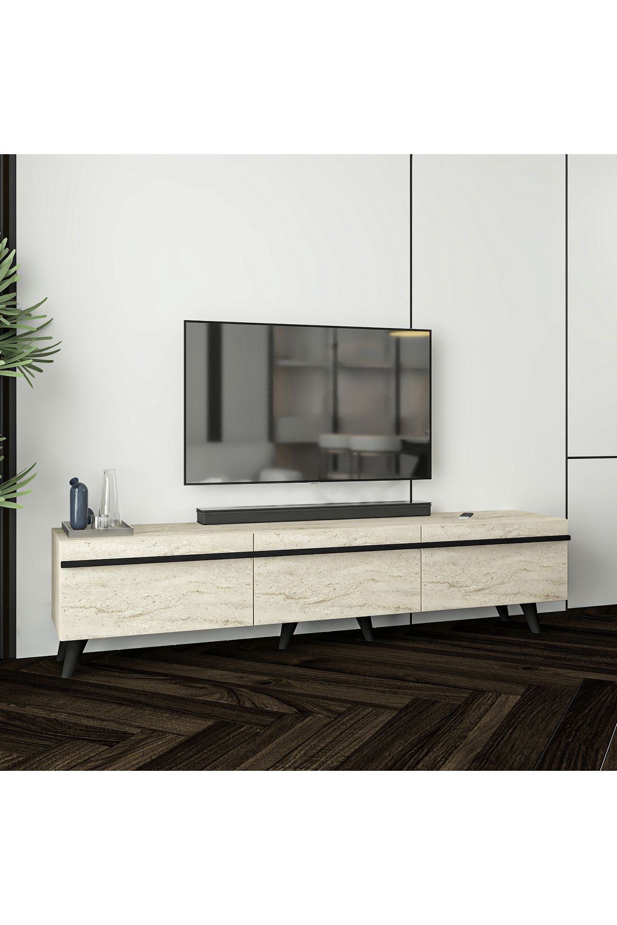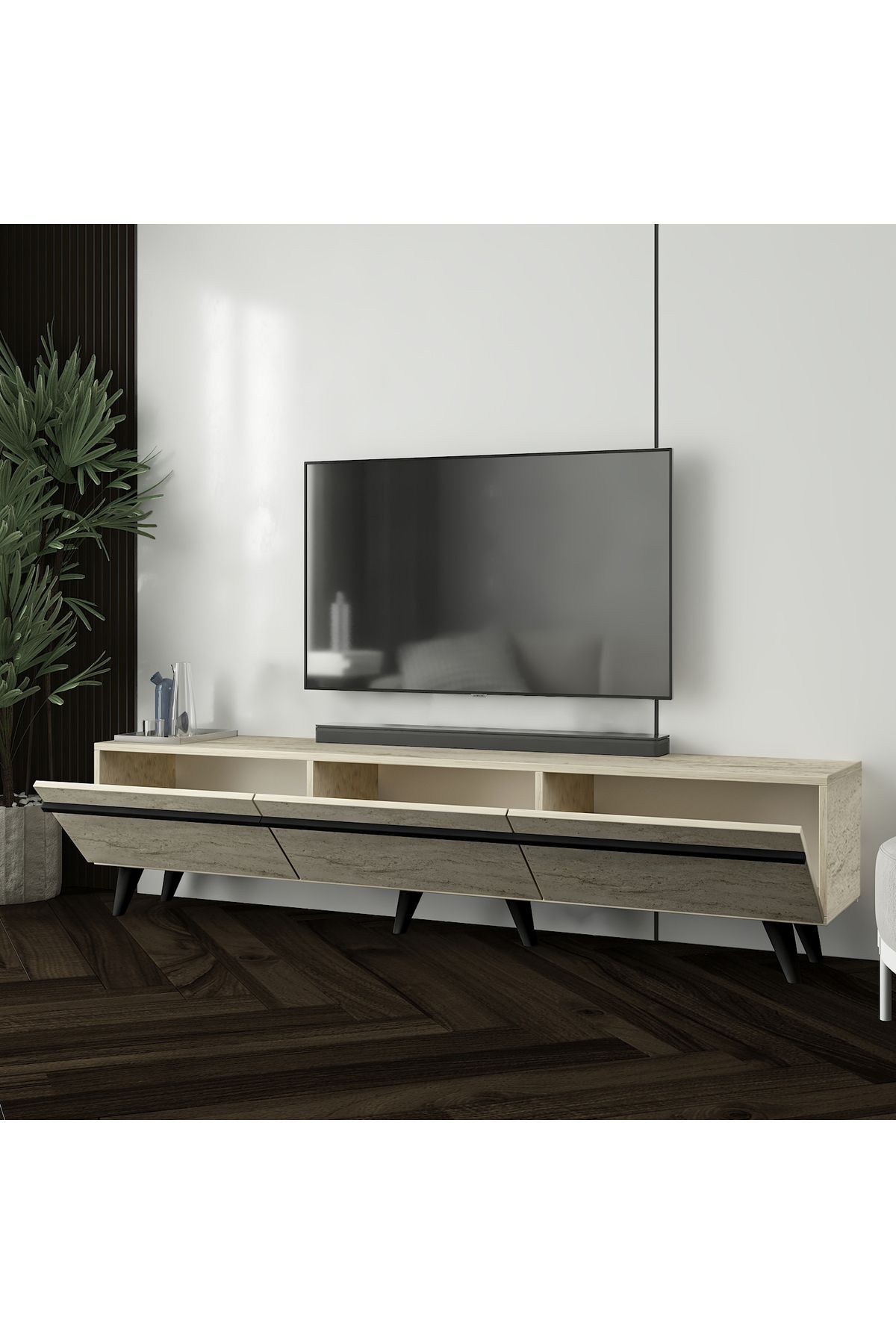 Plastik malzemeden üretilmiş açılı ayak yapısı sayesinde zemine zarar vermez ve kolay taşınabilir. Modern çizgilere sahip yüzey tasarımıyla, TV üniteleri arasında fark yaratır. 180 cm genişliği sayesinde 65 inçe kadar televizyonlarla rahatlıkla uyumludur.