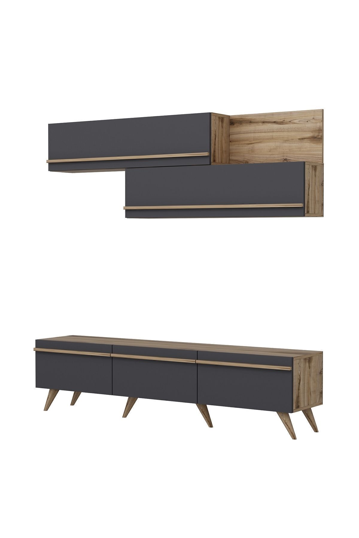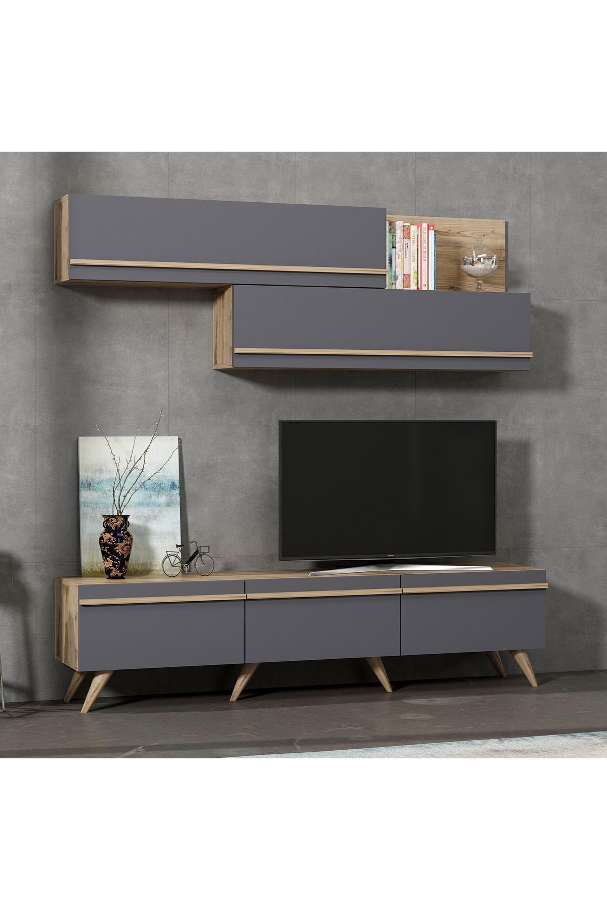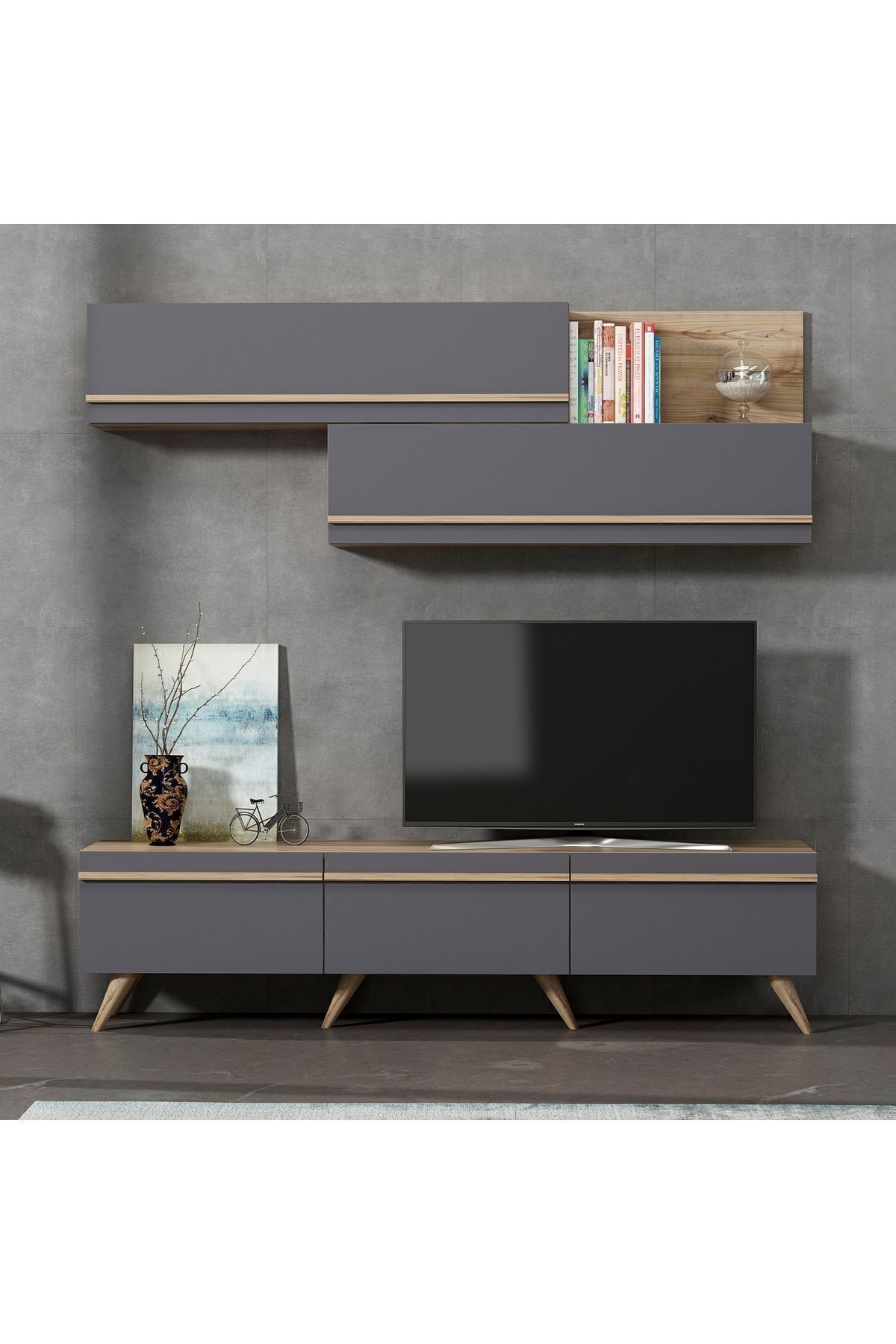 Amsterdam TV Ünitesi, modern yaşam alanları için estetik ve fonksiyonu bir arada sunuyor. 3 kapaklı alt modül ve duvara monte edilebilen 2 kapaklı, kitaplık bölümlü üst raf modülleriyle hem depolama alanı sağlar hem de dekoratif şıklık katar. Antrasit/Antik Ceviz ve Beyaz/Safir Meşe olmak üzere iki farklı renk seçeneğiyle, her zevke hitap eder. Alt modül üzerinde televizyon, dekoratif objeler ve ses sistemleri için ideal genişlik sunarken; üst modüller kitap, çerçeve ve aksesuarlar için işlevsel raflar içerir.