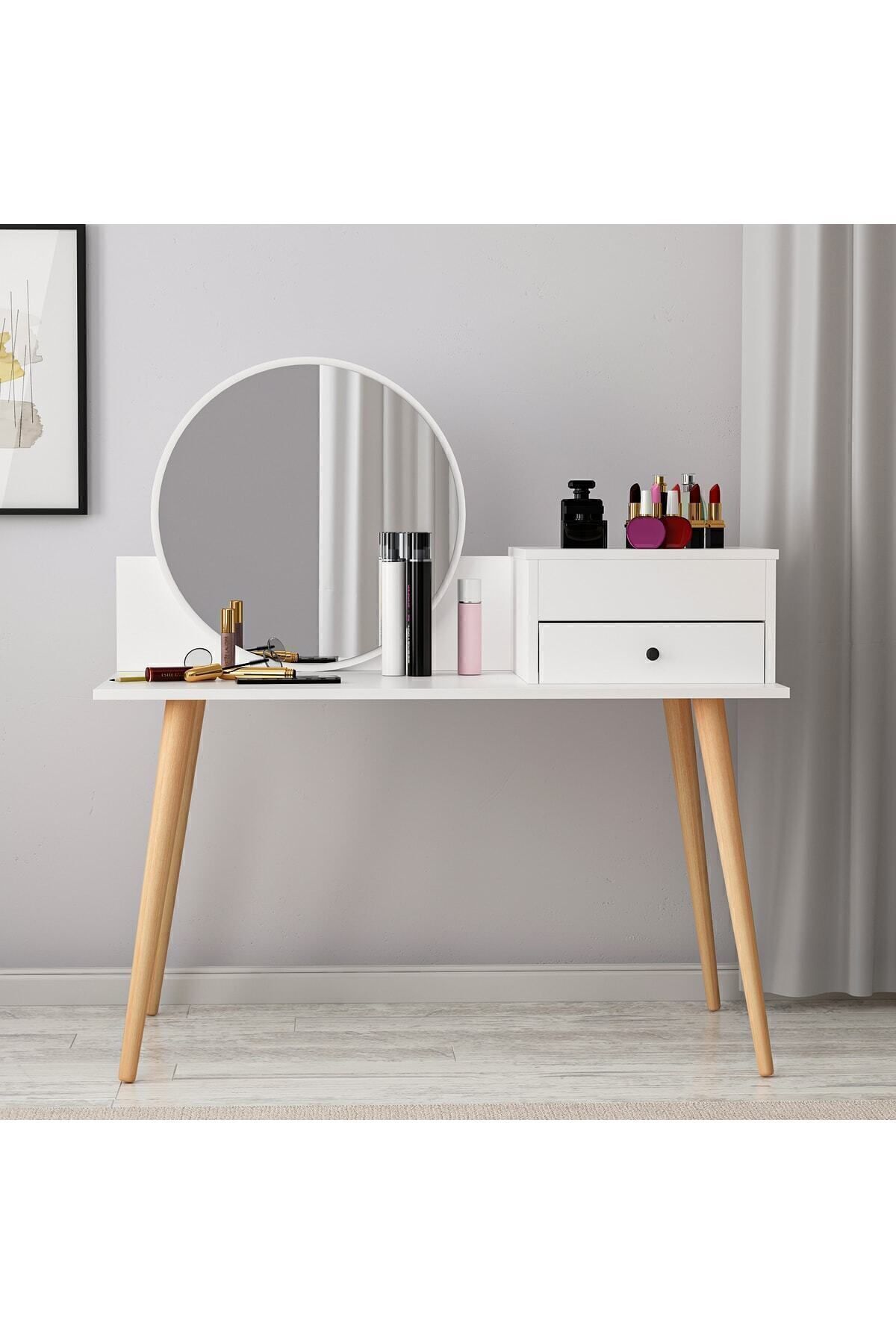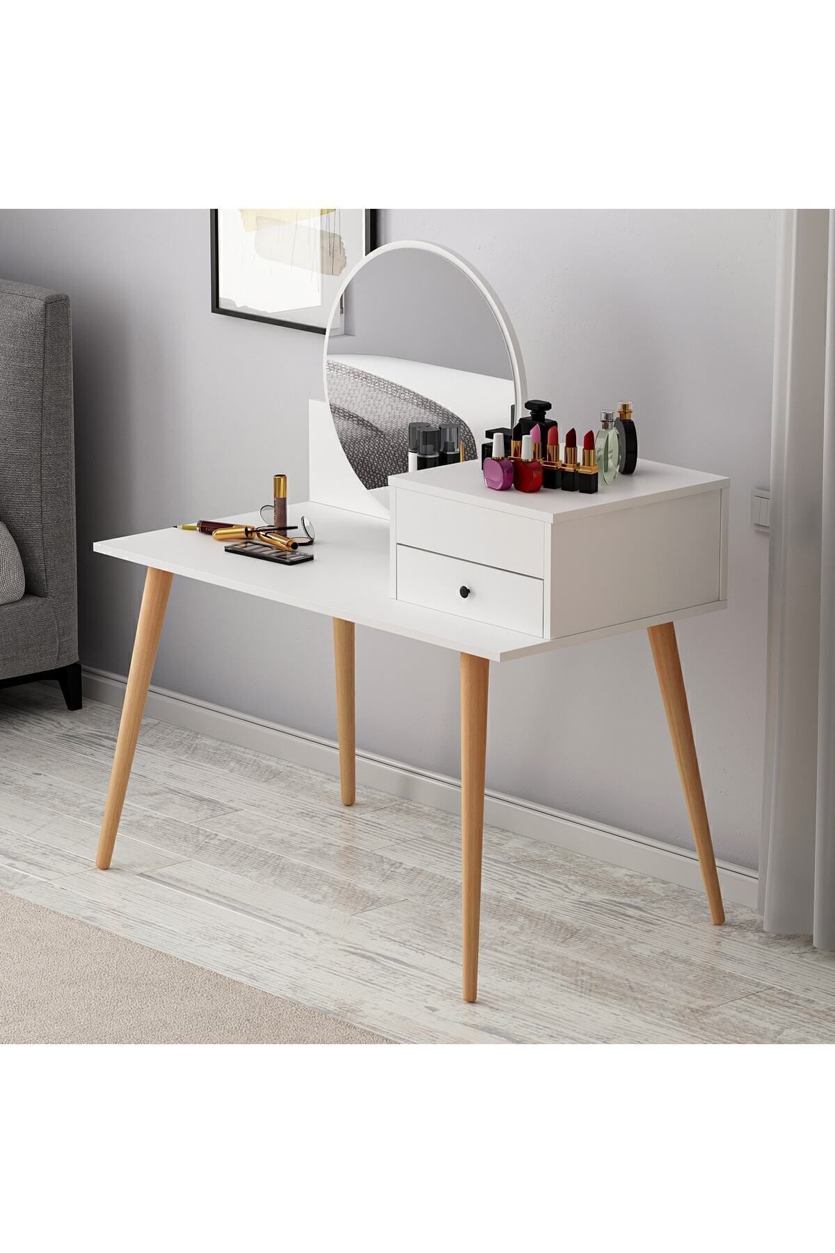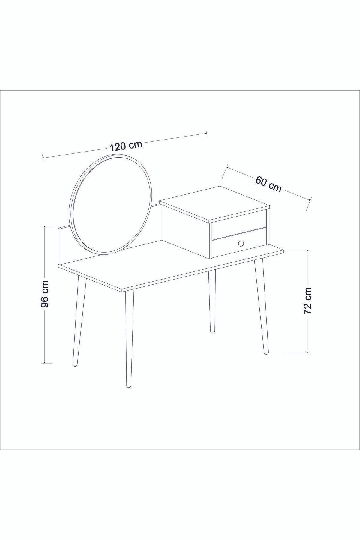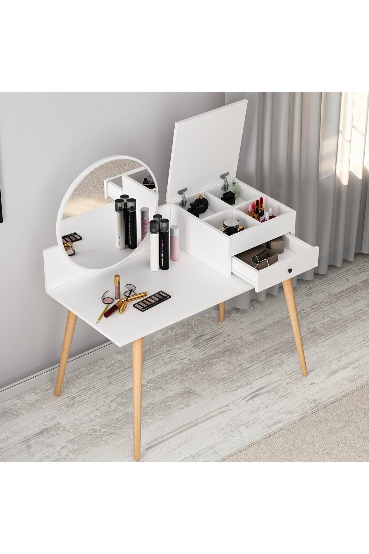 Yuvarlak aynası, geniş kullanım yüzeyi, gizli takı bölmesi ve çekmecesi ile tüm makyaj ve takı düzeninizi kolayca sağlar. Ahşap görünümlü zarif ayakları ile sağlamlık sunarken, minimalist çizgileri sayesinde modern ve klasik dekorasyonlarla uyum sağlar.
