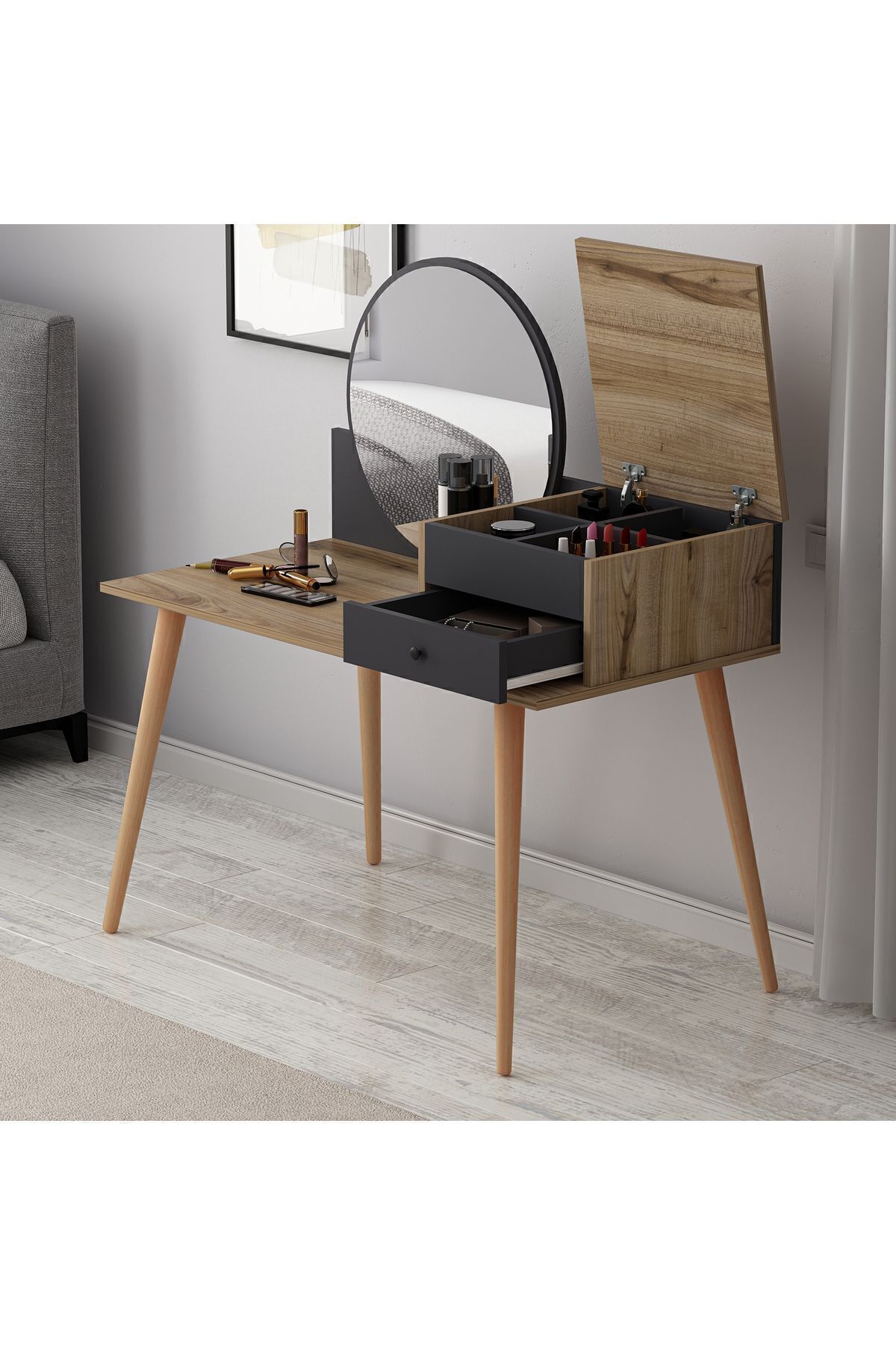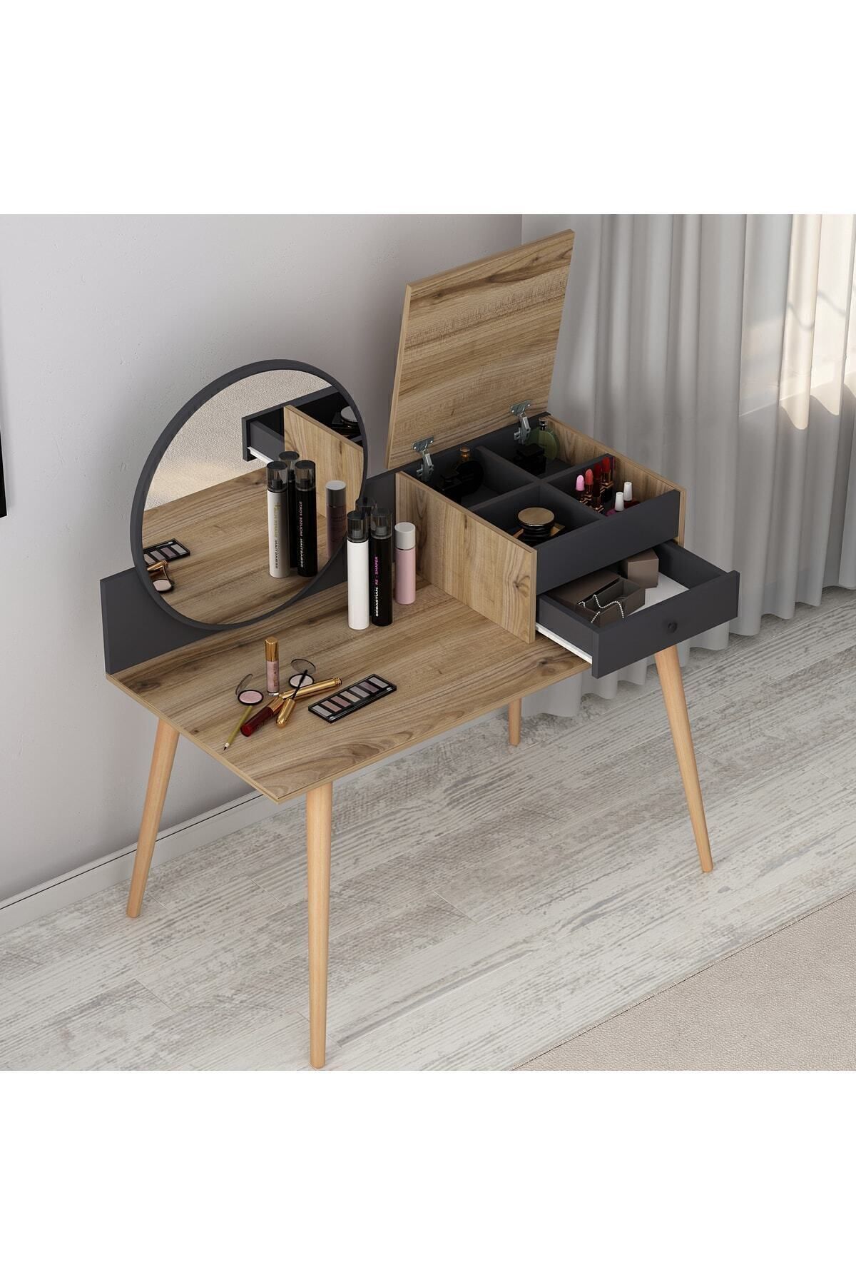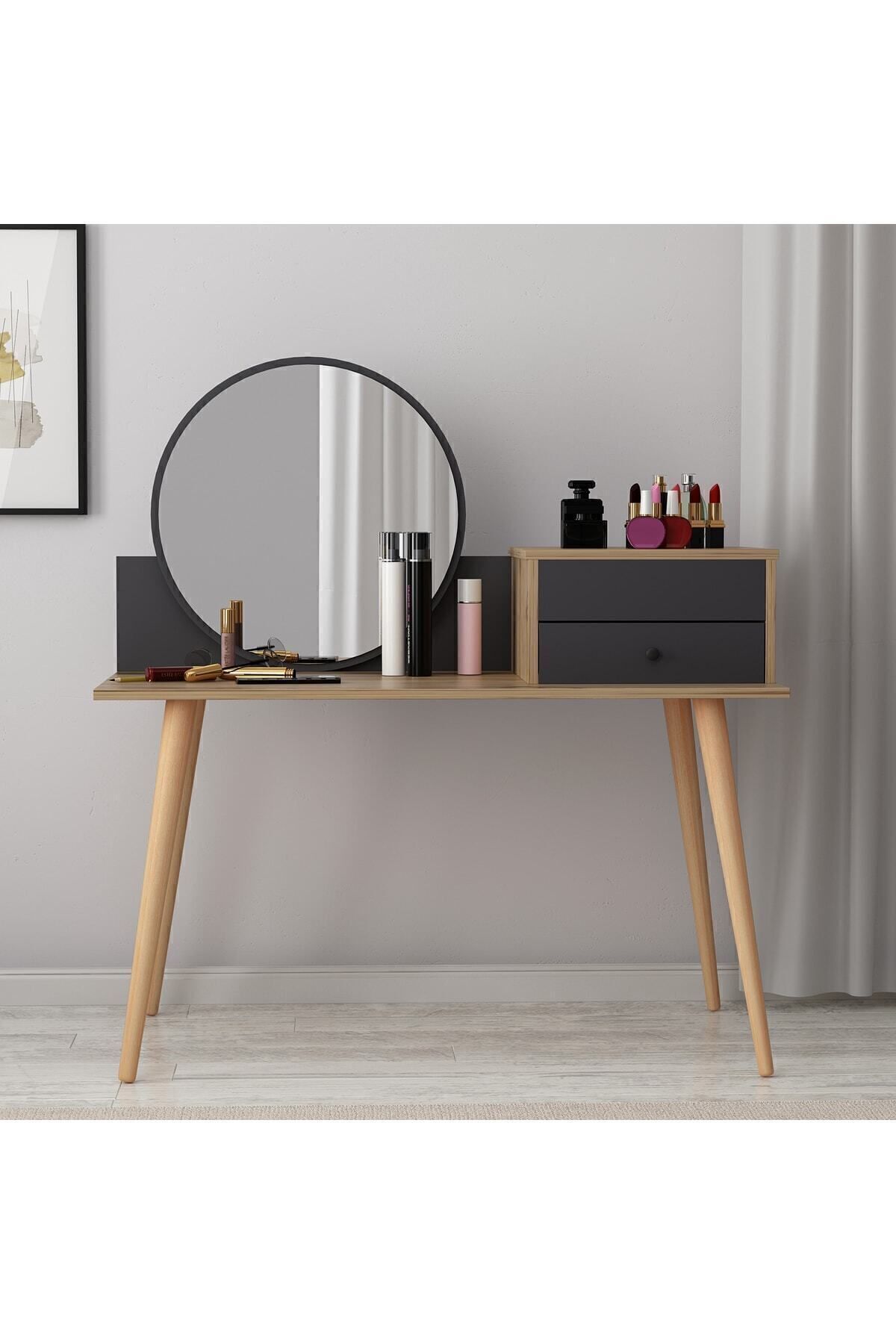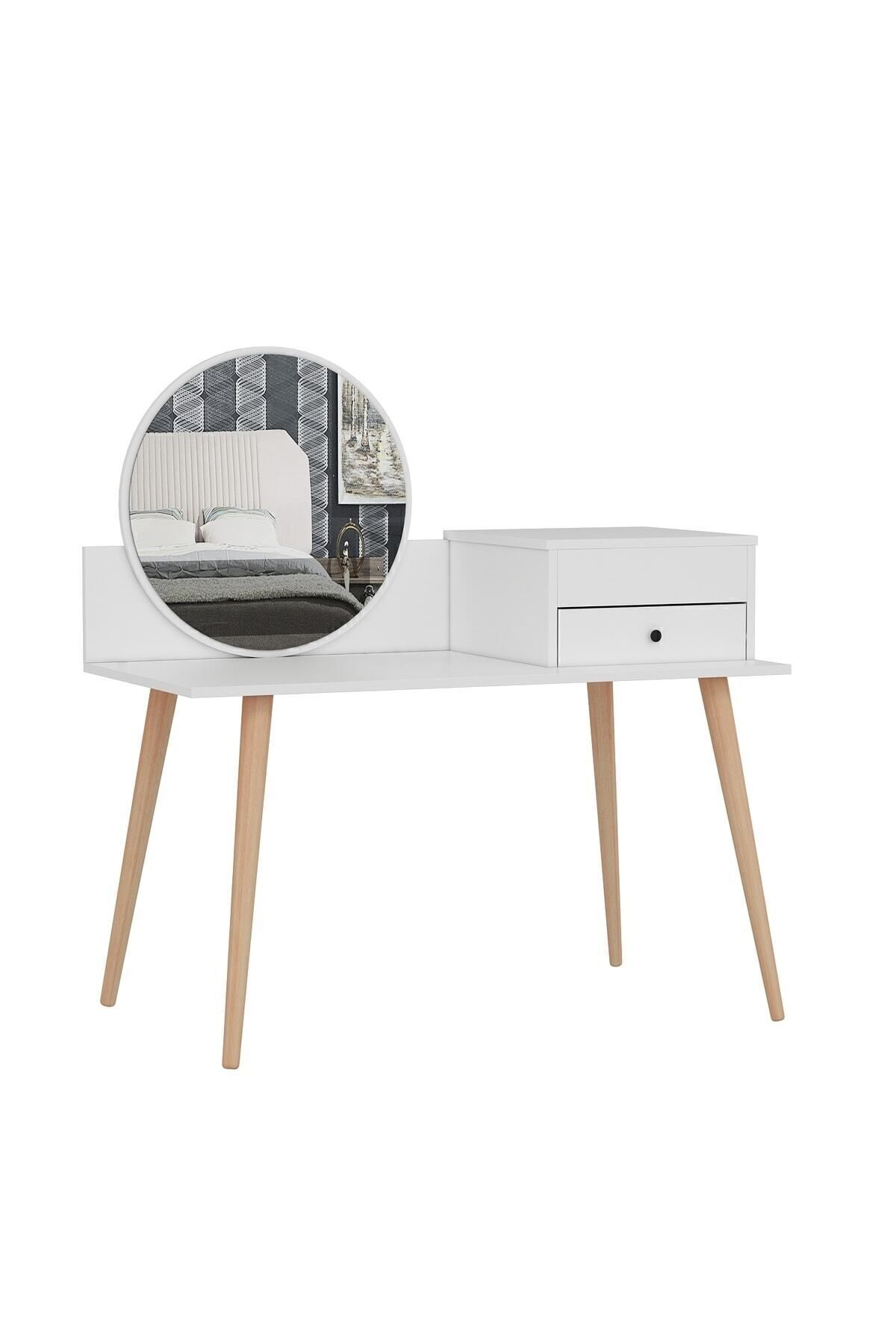 Yuvarlak aynası, geniş kullanım yüzeyi, gizli takı bölmesi ve çekmecesi ile tüm makyaj ve takı düzeninizi kolayca sağlar. Ahşap görünümlü zarif ayakları ile sağlamlık sunarken, minimalist çizgileri sayesinde modern ve klasik dekorasyonlarla uyum sağlar.