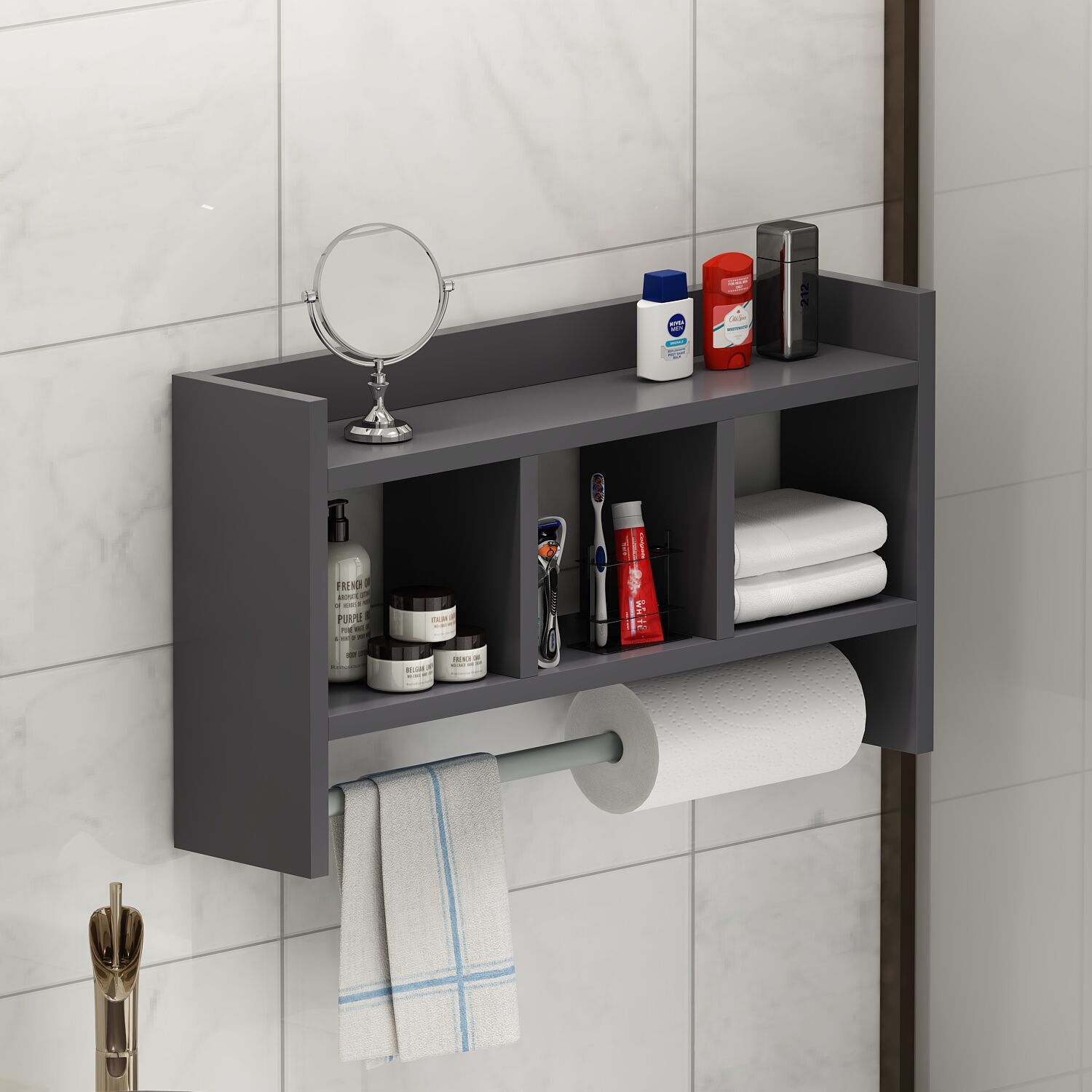 Üst kısmında ekstra raf yüzeyi, orta bölümde 3 adet geniş bölme ve alt kısmında hem havlu hem de kağıt havlu/peçete askılığı bulunmaktadır.