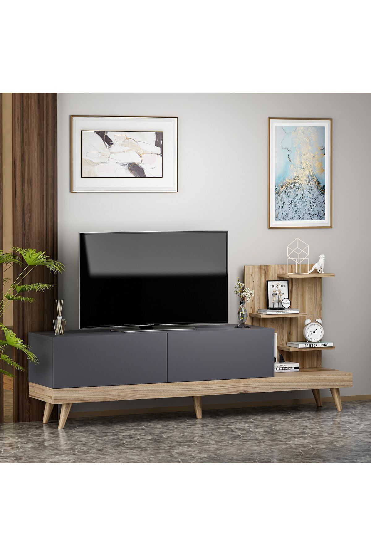 Dizayn TV Sehpası, modern çizgileri ve fonksiyonel yapısıyla yaşam alanlarınıza estetik bir dokunuş sunar. Antrasit gövde ile Antik Ceviz veya Traverten renk seçenekleri, farklı dekorasyon stillerine uyum sağlar. Kapaklı bölmeleri ve dekoratif rafları sayesinde hem düzen hem de görsellik bir arada.