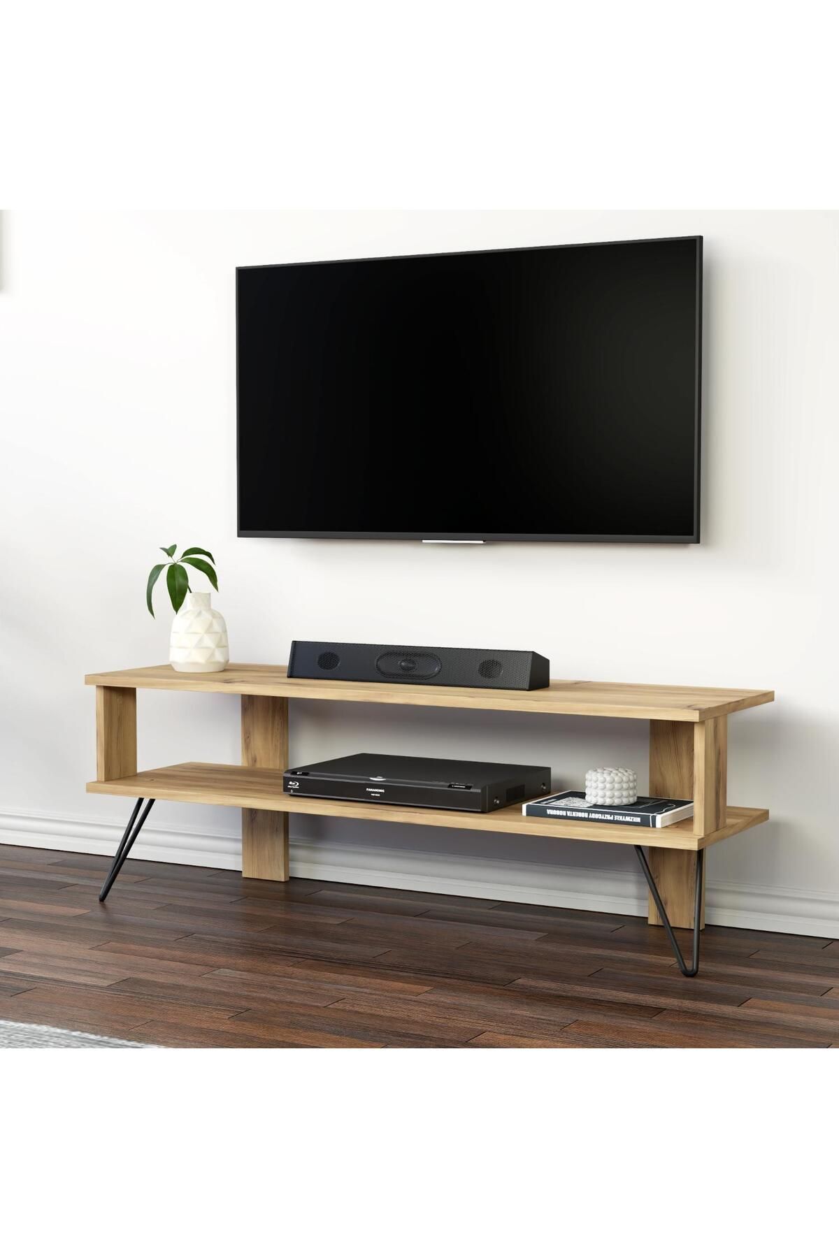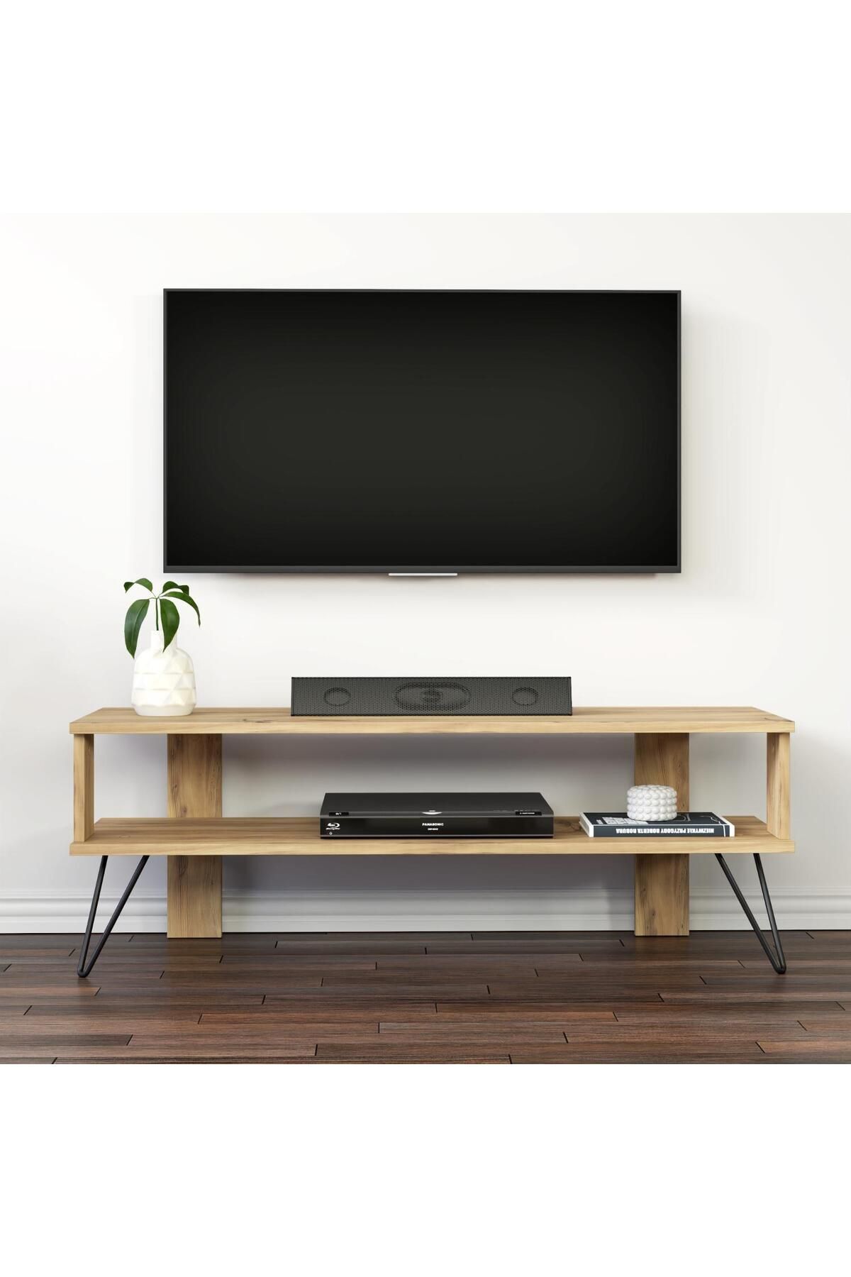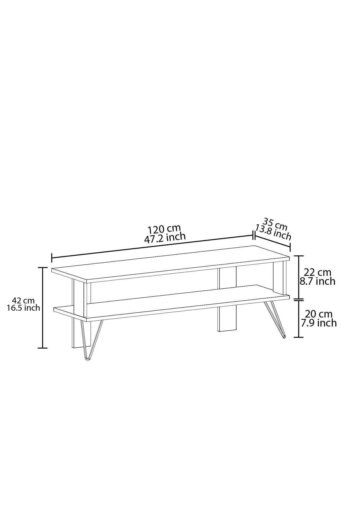 Duama TV Sehpası, sade ve şık tasarımıyla modern yaşam alanlarına güçlü bir karakter kazandırır. Metal ayakları sayesinde hem sağlam hem de endüstriyel bir görünüm sunar. Açık raflı yapısı, medya cihazları ve dekoratif objeler için ideal bir kullanım alanı sağlar.