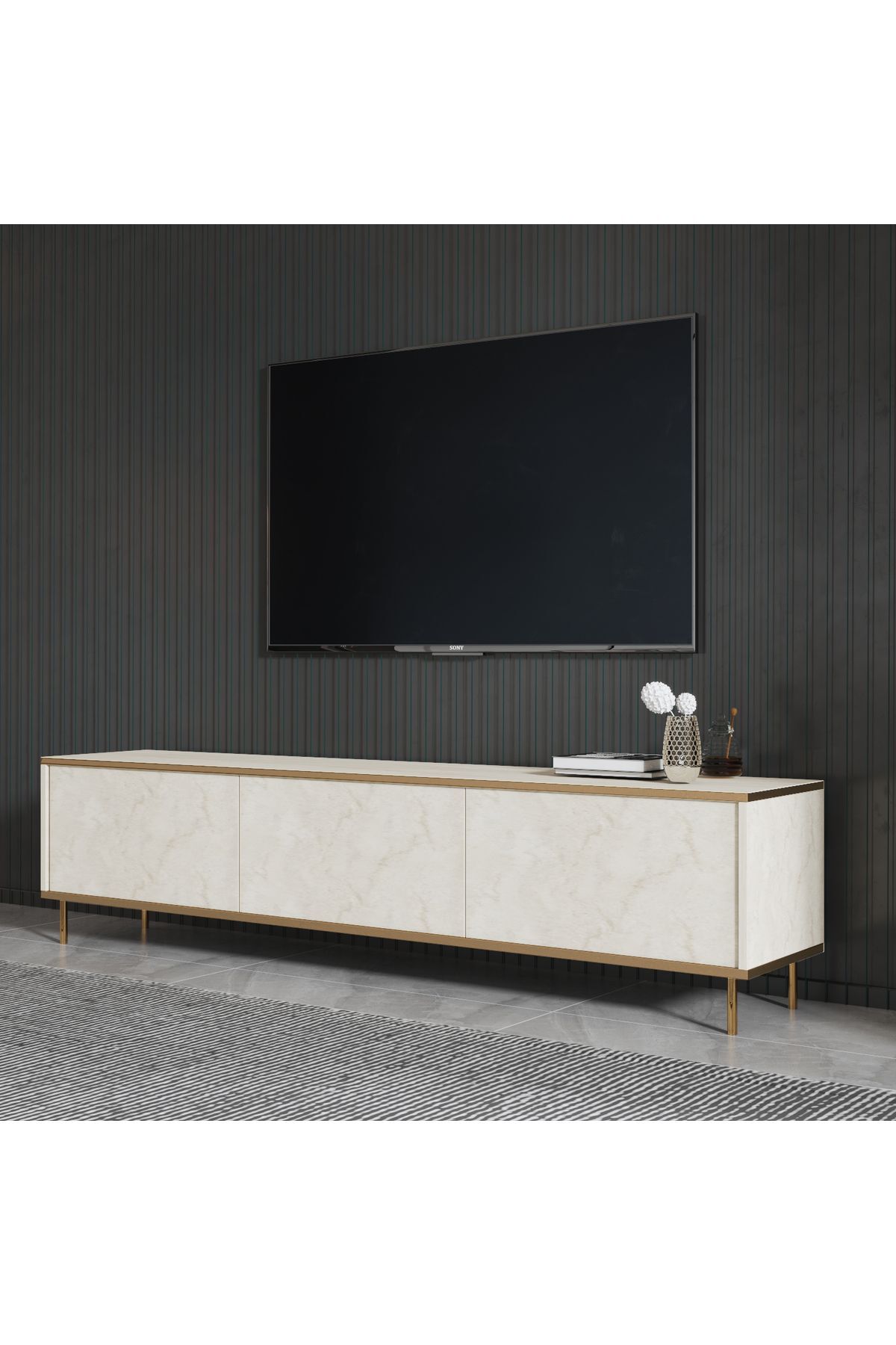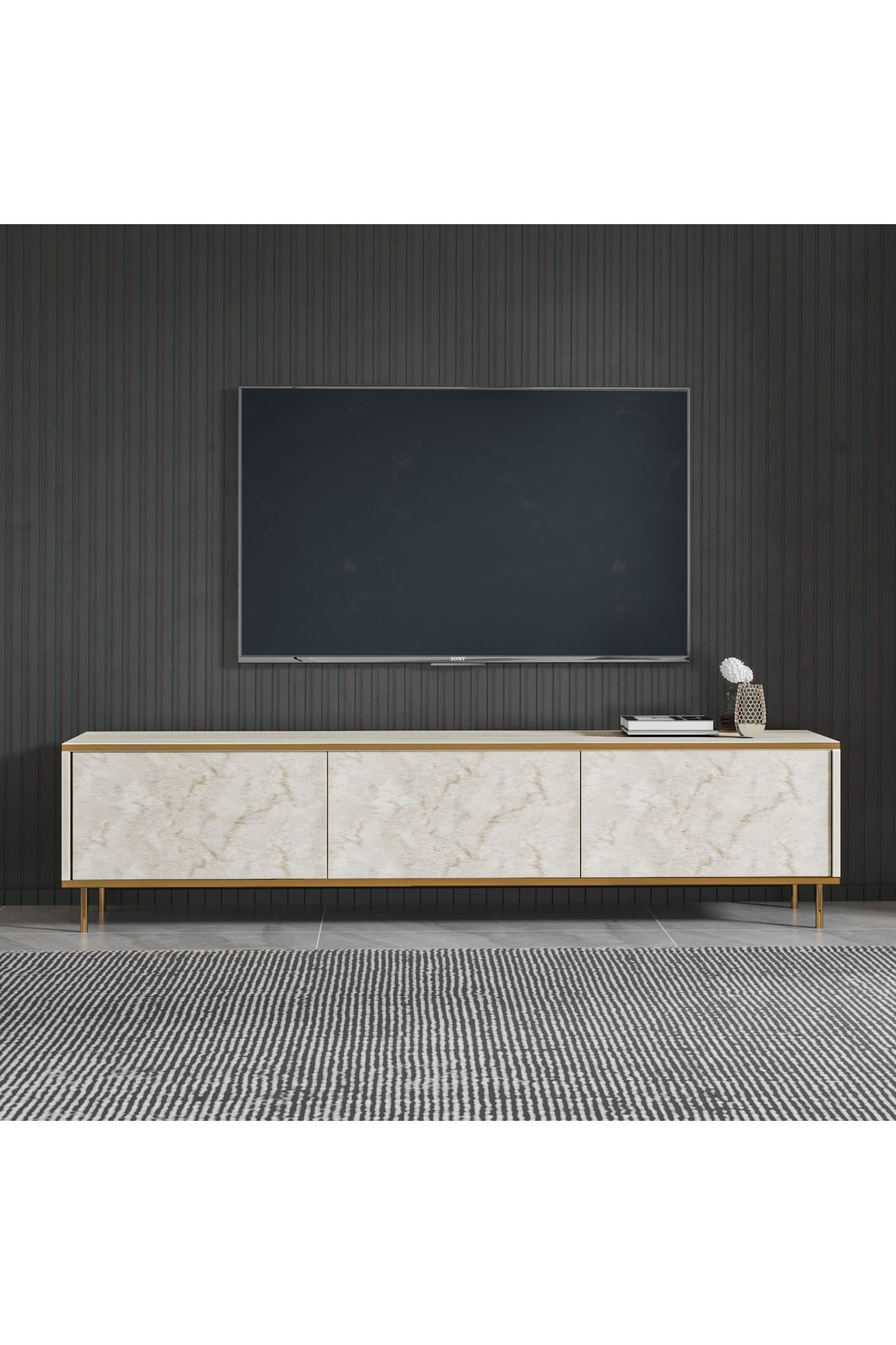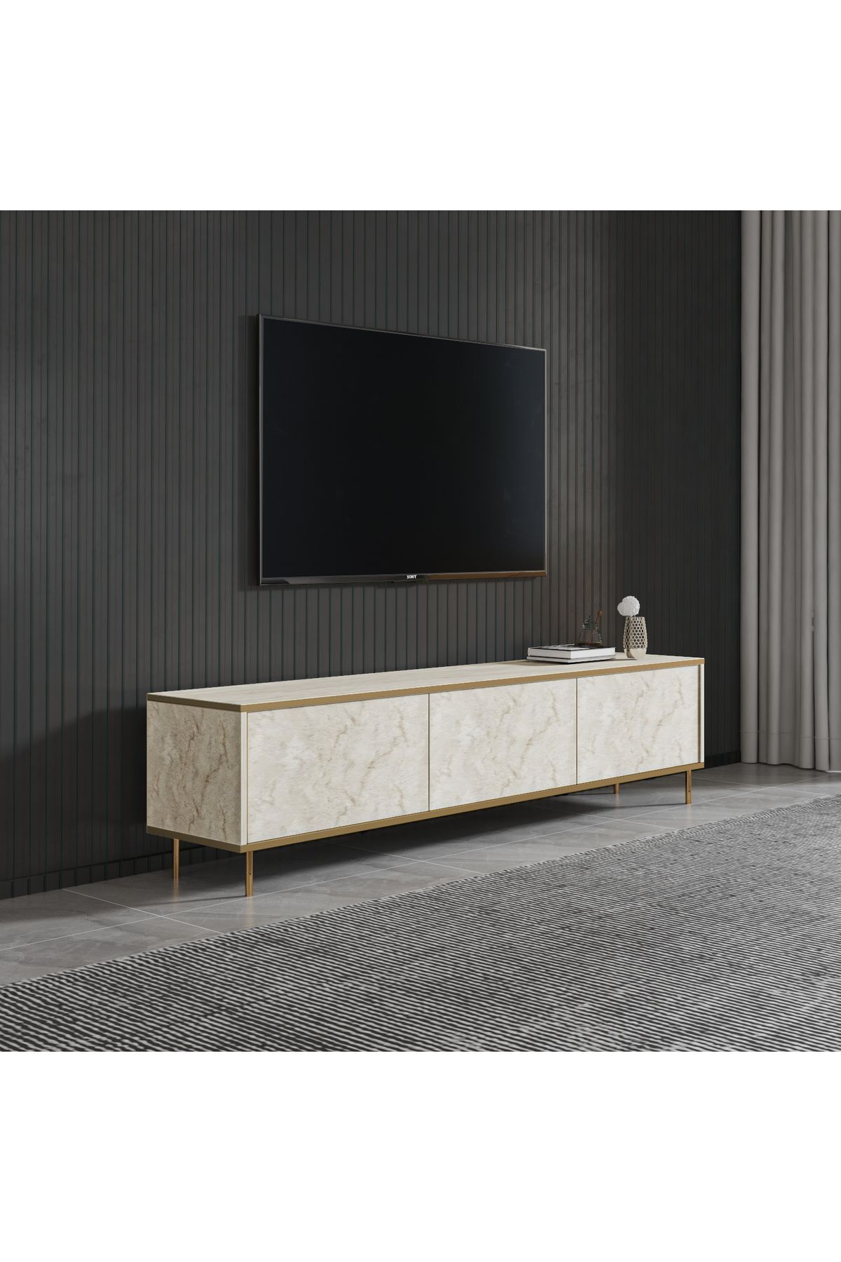 İmaj TV Ünitesi, modern çizgileri ve şık detaylarıyla yaşam alanınıza zarif bir dokunuş katıyor. 180 cm genişliğiyle büyük ekran televizyonlar için ideal bir kullanım sunarken, 3 kapaklı bölmesi sayesinde geniş ve düzenli bir depolama alanı sağlar. Metal ayaklı tasarımı, ürüne sağlamlık ve modernlik kazandırır. Üst tabla ve ön yüzeylerde kullanılan mermer desenli yüzey kaplamaları, ünitenin lüks görünümünü pekiştirir.