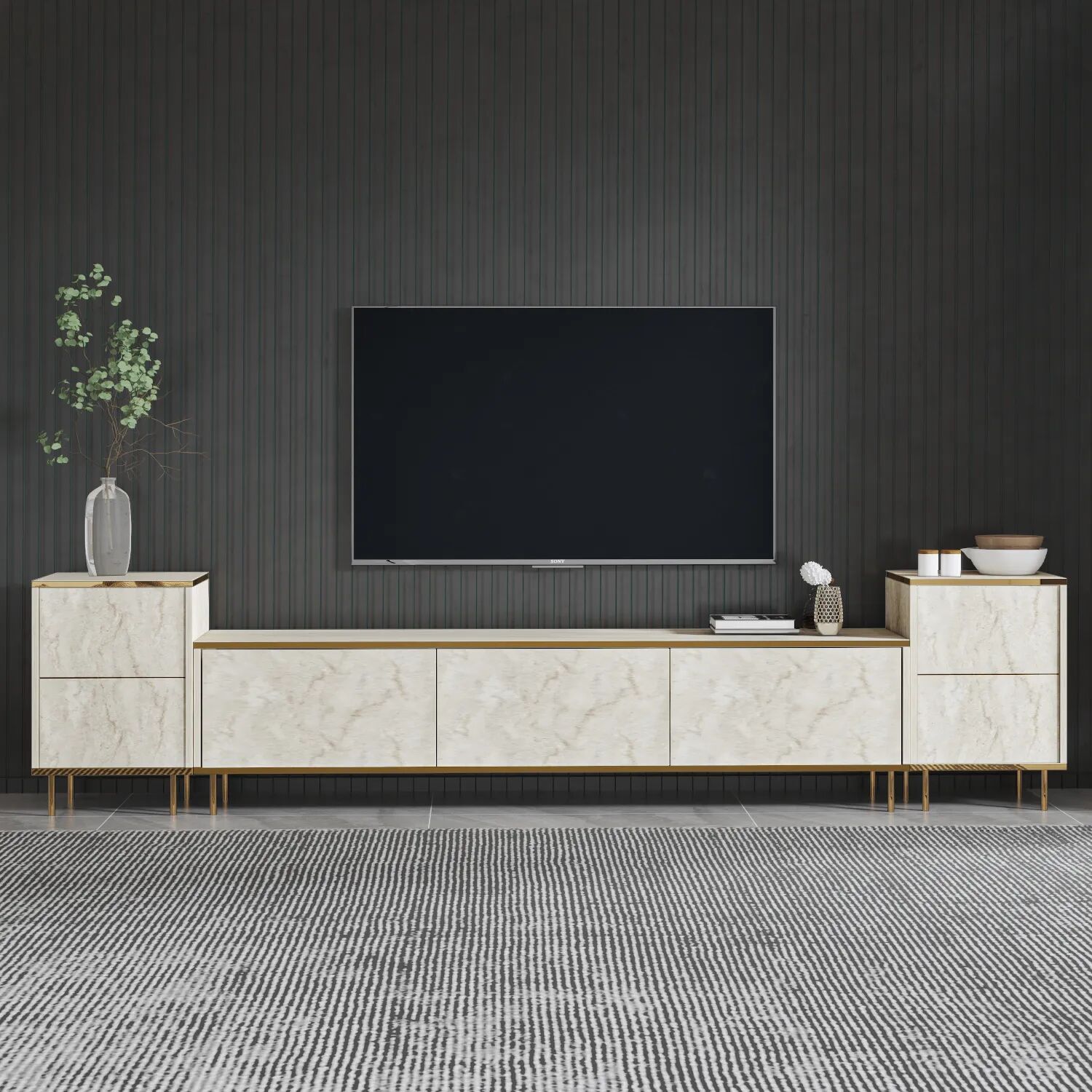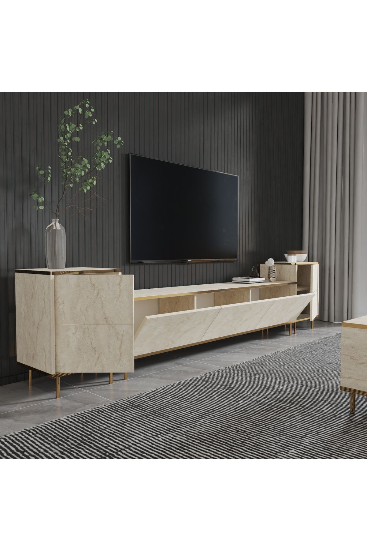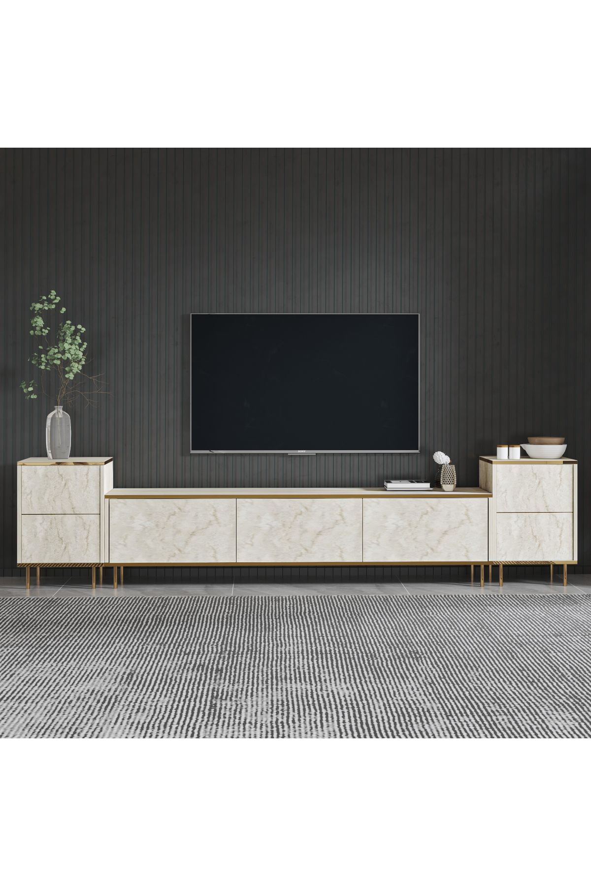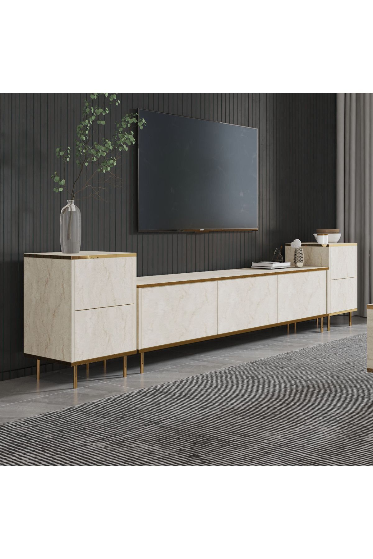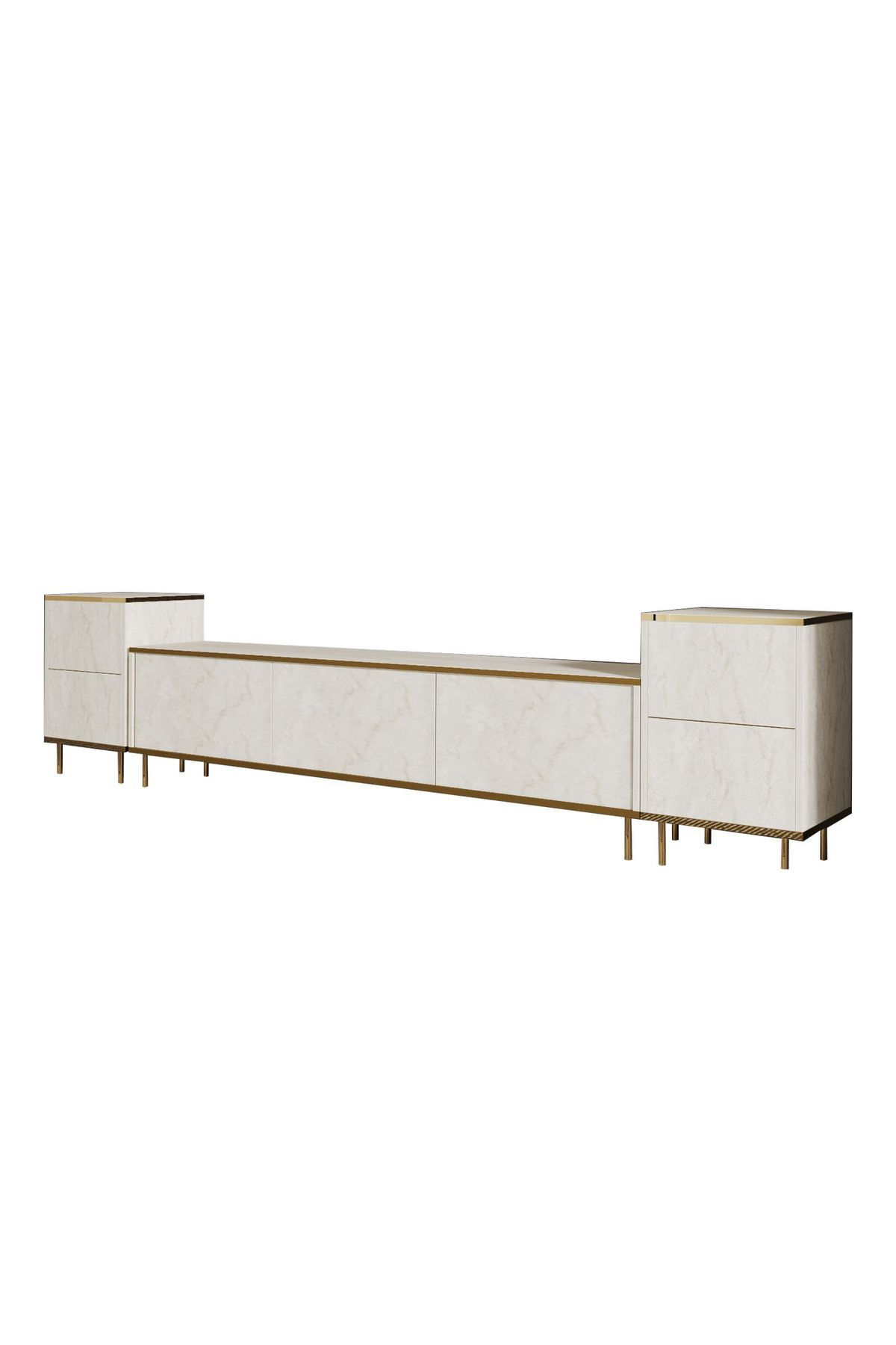 İmaj TV Ünitesi ve Komodin Seti, zarif detayları ve modüler yapısıyla modern yaşam alanlarına yepyeni bir soluk getiriyor. 260 cm genişliğe sahip bu set; kapaklı iki yan komodin, merkezi 3 kapaklı TV ünitesi ve lüks mermer desenli yüzeylerle hem estetik hem de fonksiyonellik sunuyor.