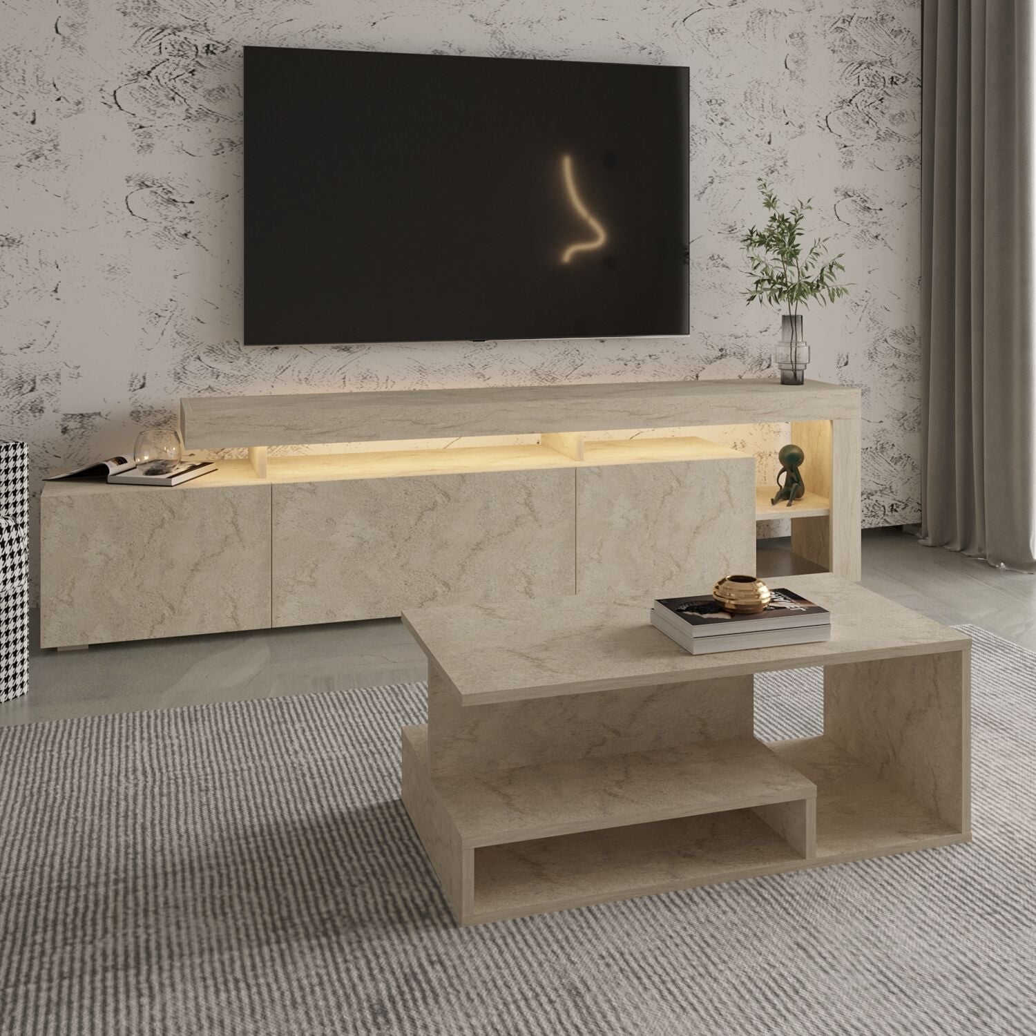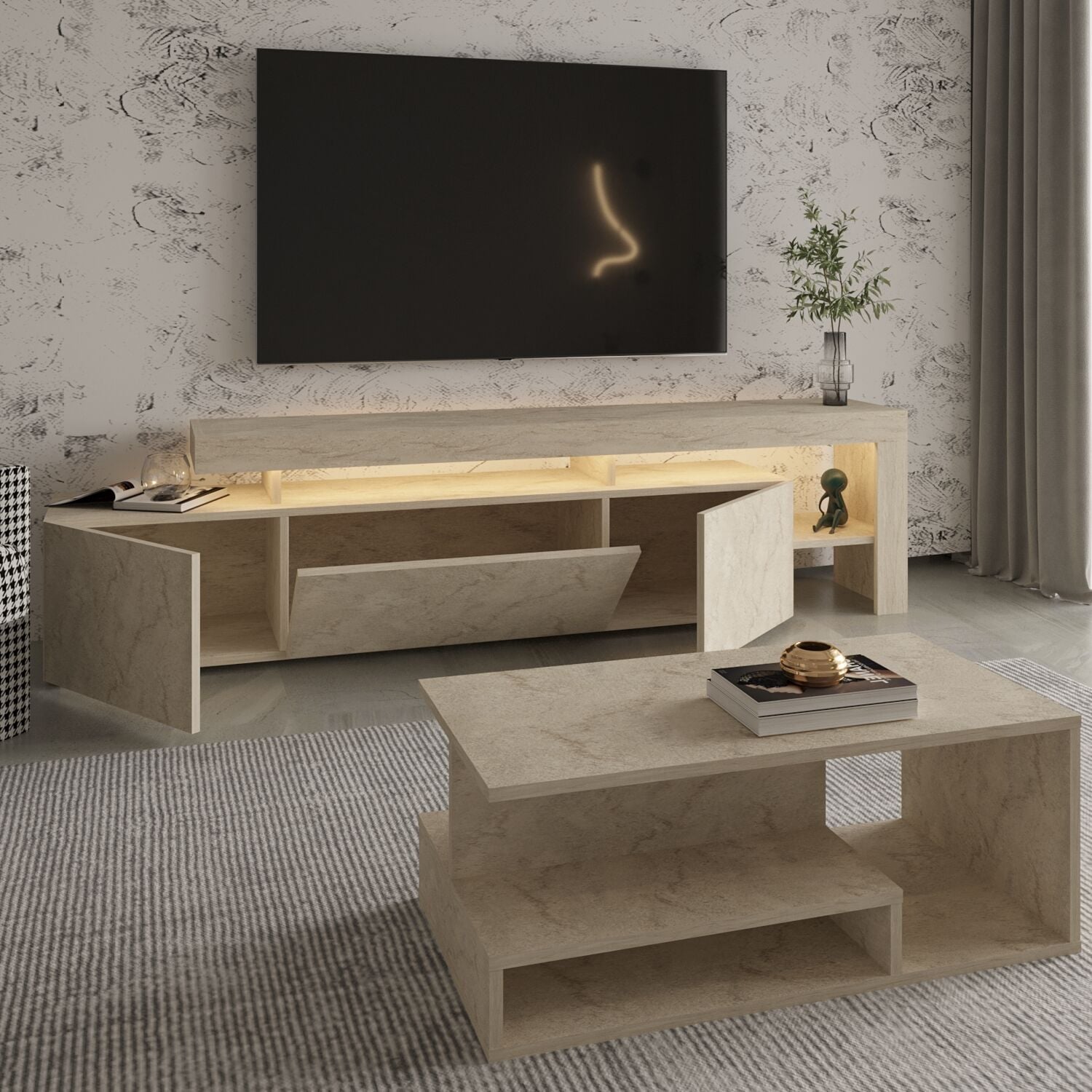 Bu set, hem estetik hem de fonksiyonel yapısıyla salonunuza modern bir atmosfer kazandırır. LED ışıklar sayesinde akşamları sıcak ve şık bir ambiyans yaratır. Orta sehpa ise açık raflı tasarımıyla dekoratif düzenlemeler için ideal bir kullanım sunar.