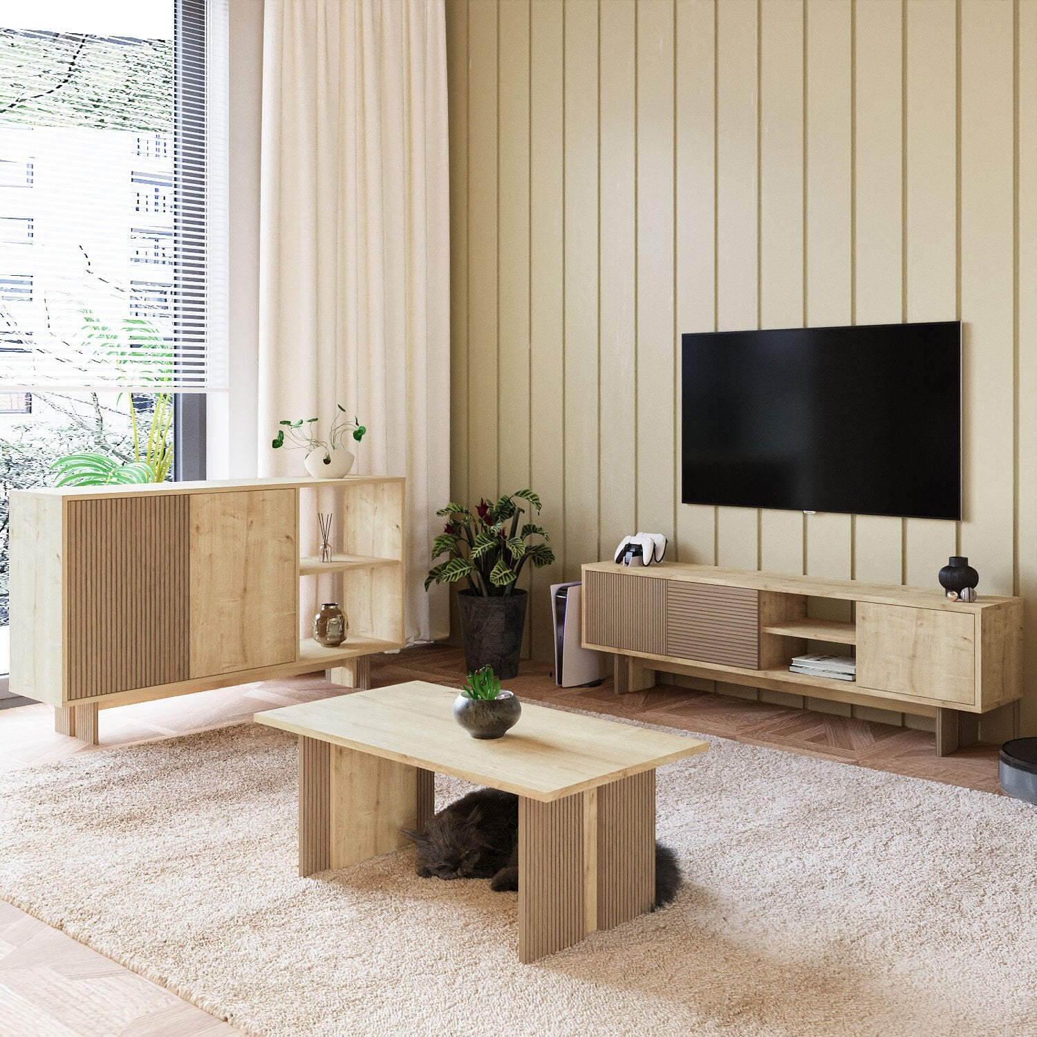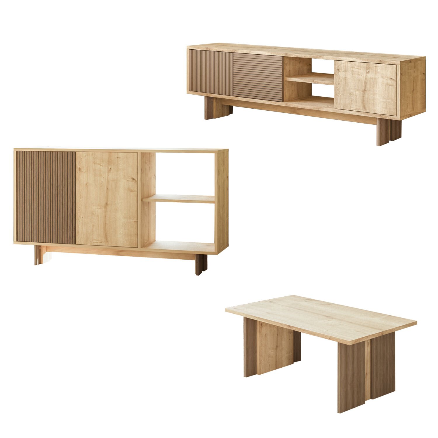 Ravello Oturma Odası Set, modern çizgileri ve fonksiyonel tasarımıyla yaşam alanlarınıza şıklık ve uyum kazandırır. Set; 2 kapaklı ve 2 geniş açık raflı konsol, 3 kapaklı TV sehpası ve minimalist orta sehpadan oluşmaktadır. Hem depolama hem de dekoratif kullanım imkanı sunan bu set, oturma odanızda bütünlük ve estetik sağlar.