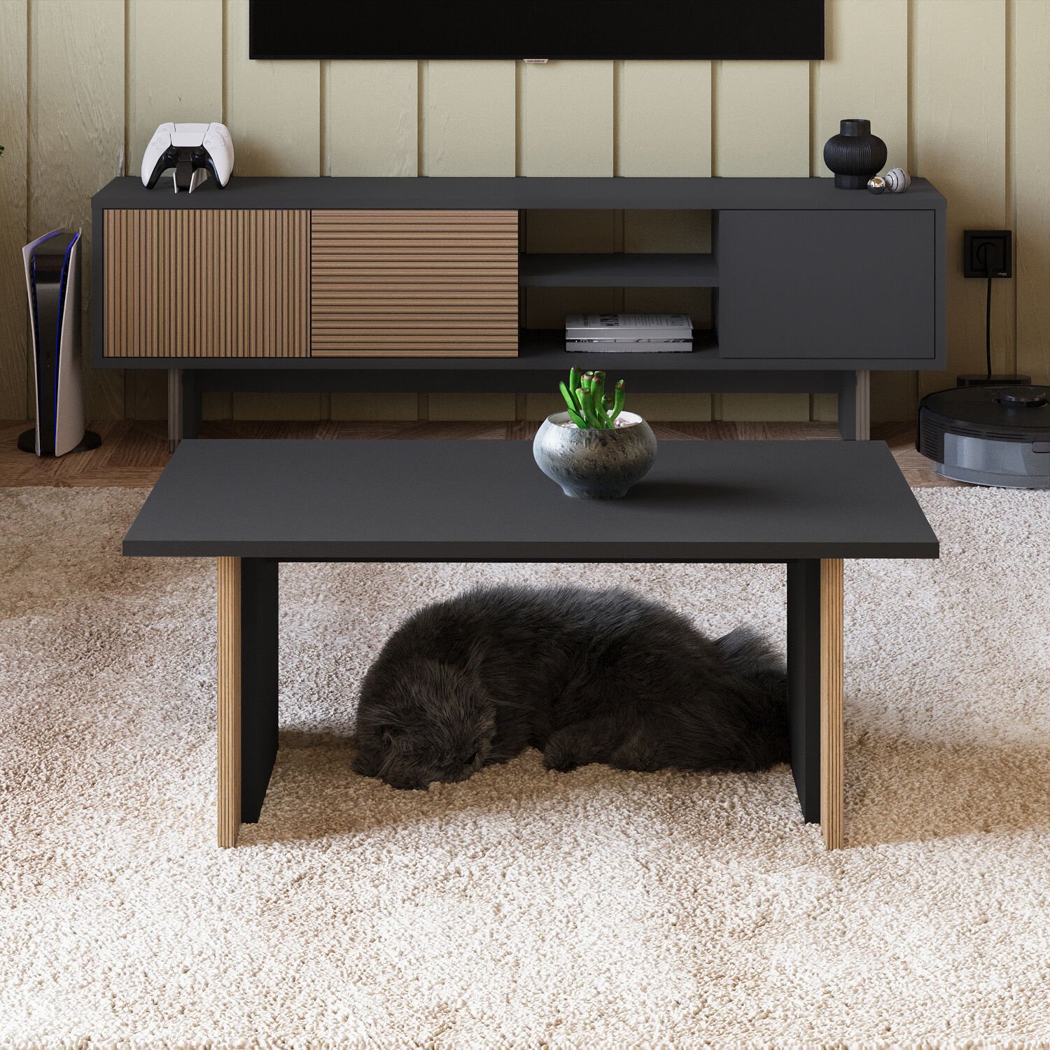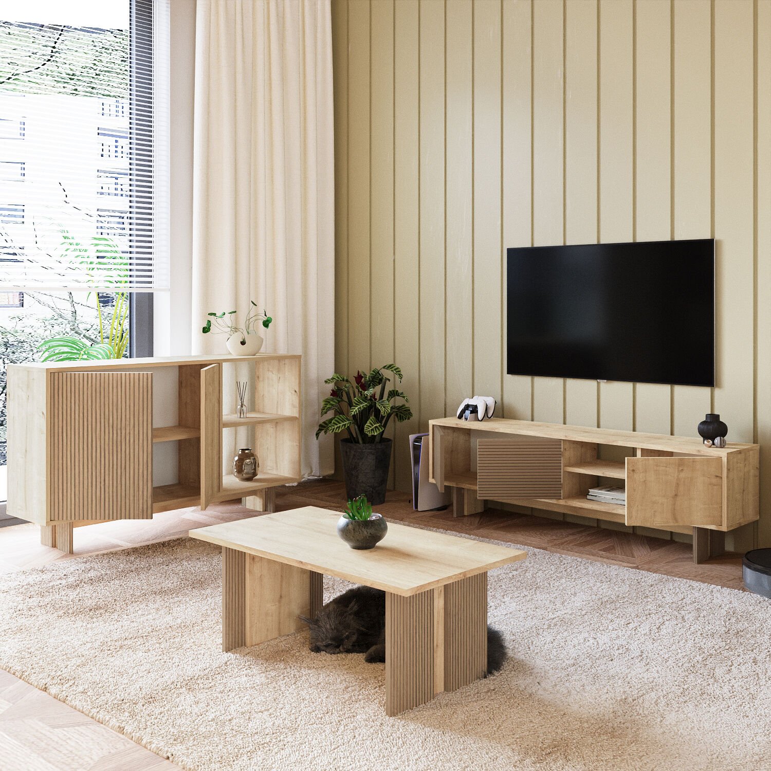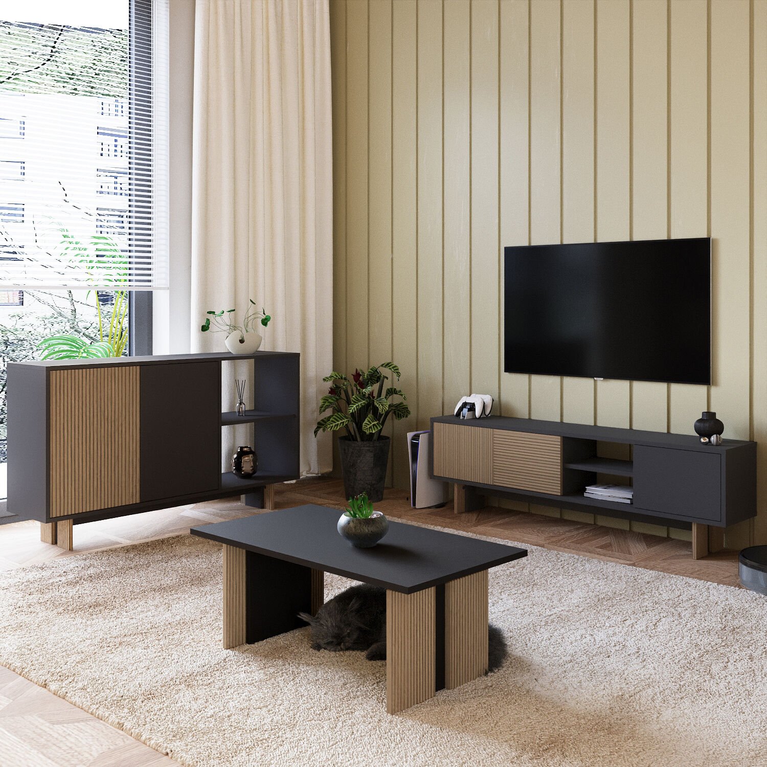 - TV Sehpası: 150 cm (genişlik) × 30 cm (derinlik) × 45 cm (yükseklik)