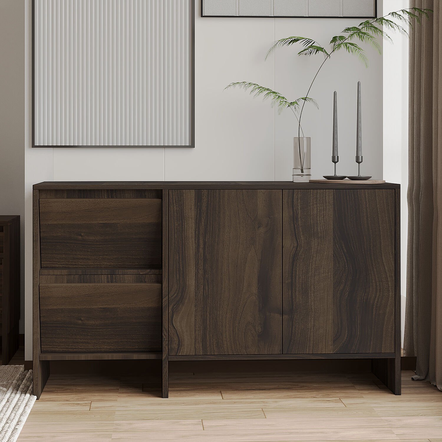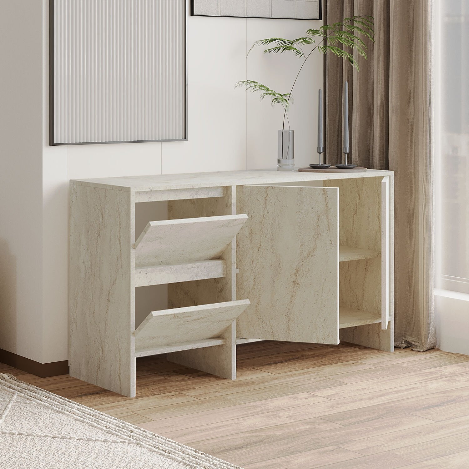 Laris 130 cm Konsol, modern yaşam alanlarına sade ve şık bir dokunuş katmak isteyenler için tasarlandı. Minimalist çizgileri, yüksek ayaklı yapısı ve 4 kapaklı geniş depolama alanıyla hem estetik hem de fonksiyonel bir çözüm sunar. Traverten, ceviz, beyaz, antrasit ve siyah olmak üzere 5 farklı renk seçeneğiyle her dekorasyona uyum sağlar.