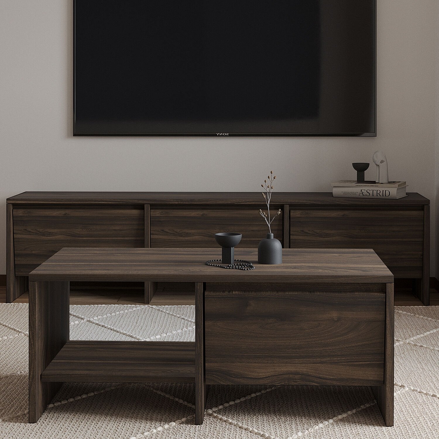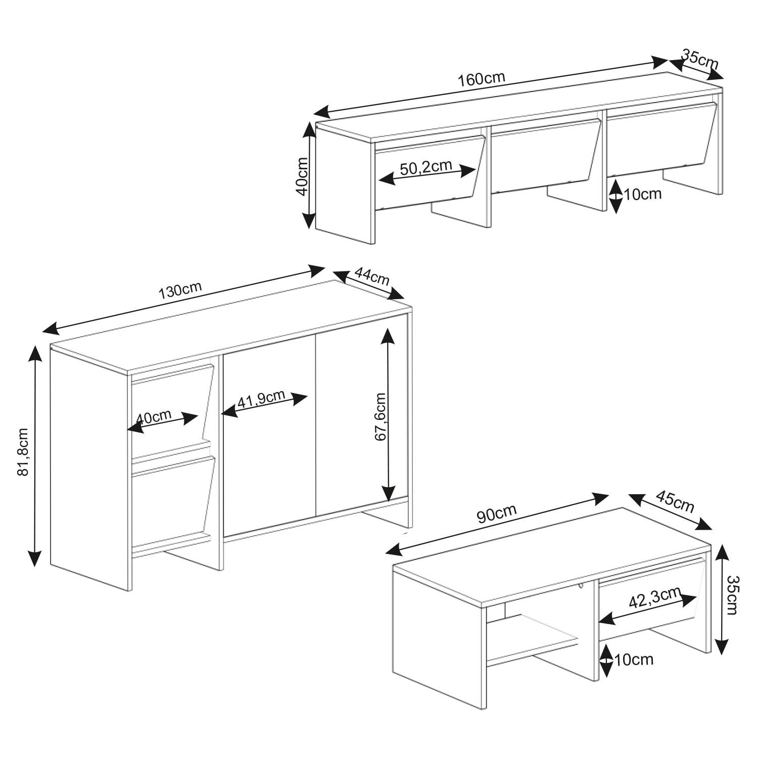 Laris Üçlü Set, modern yaşam alanları için estetik ve işlevselliği bir araya getiriyor. Set içerisinde yer alan 160 cm TV sehpası, 130 cm konsol ve 90 cm orta sehpa; sade çizgileri, dokulu yüzeyleri ve kapaklı depolama alanlarıyla hem dekoratif hem de kullanışlı bir çözüm sunar.