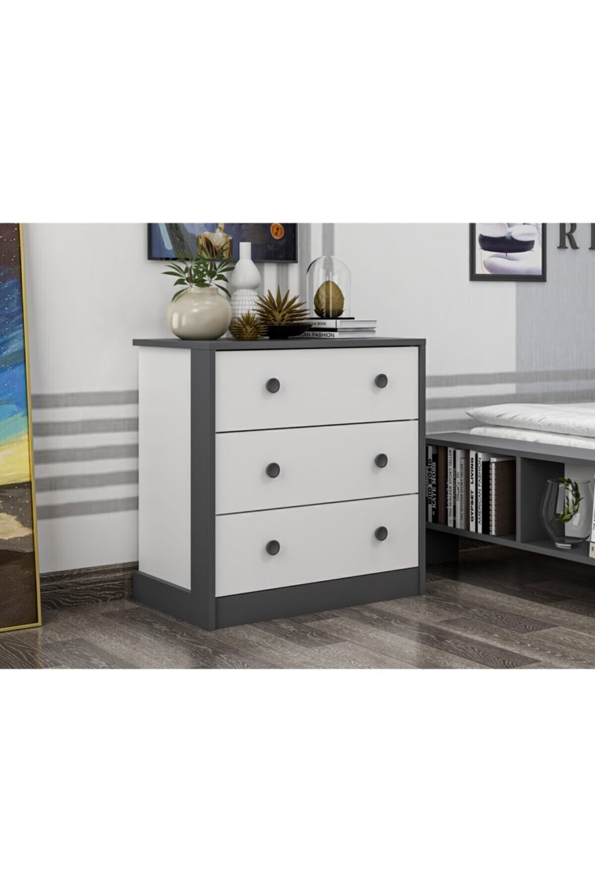 Raflı üst yüzeyi, dekoratif objeler veya aydınlatma ürünleri için ideal bir alan sunarken, sağlam gövde yapısı sayesinde uzun yıllar sorunsuz kullanım sağlar. Beyaz ve beyaz-antrasit olmak üzere iki farklı renk alternatifi ile dekorasyon tarzınıza en uygun seçimi yapabilirsiniz.