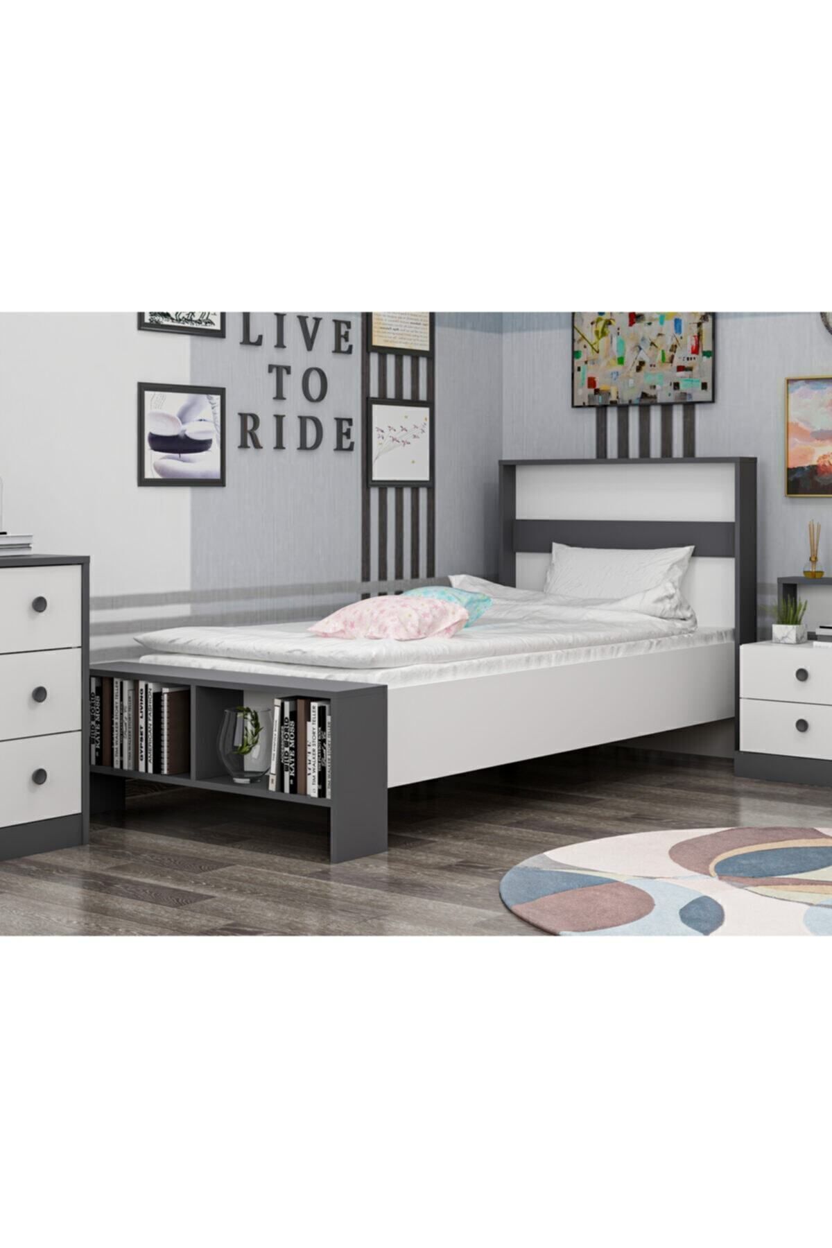 - 1 Adet Tek Kişilik Karyola: 90x190 cm yatak ölçüsüne uygundur. Başlık kısmında açık raf bölmesi ve ayak ucunda kitaplık işlevi gören bölmeler mevcuttur.