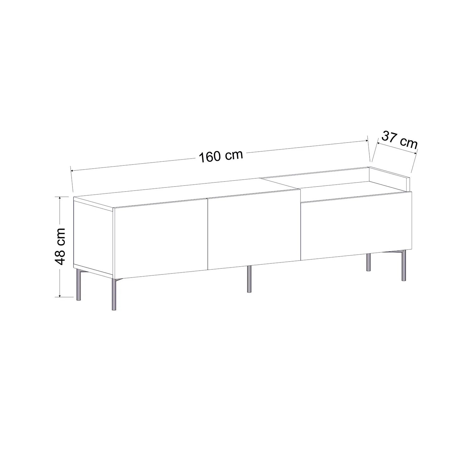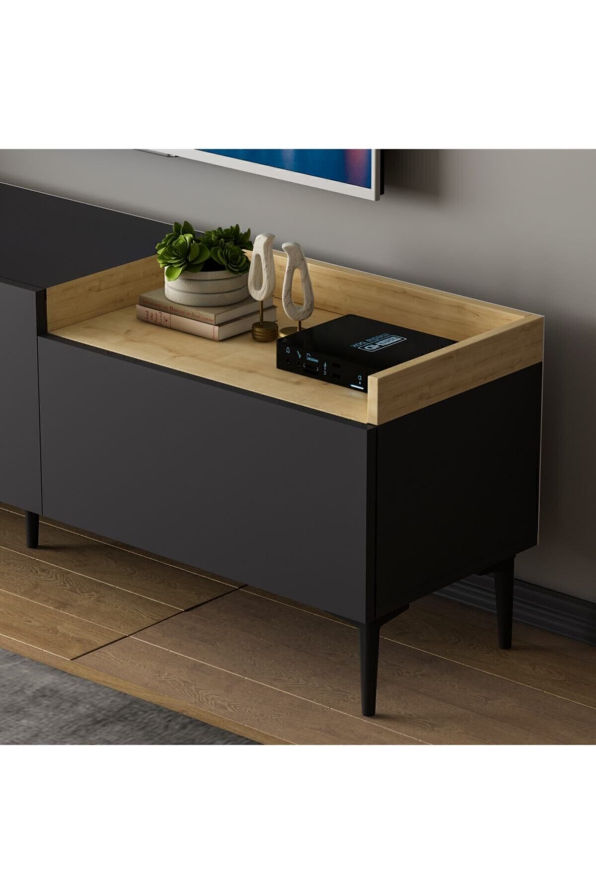 Üç kapaklı geniş depolama alanı; medya oynatıcılar, kitaplar, aksesuarlar ve kabloları gizli şekilde saklamanıza imkân tanır. Sağ köşedeki yükseltilmiş açık raf bölmesi, hem dekoratif bir detay hem de işlevsel bir kullanım alanı sunar. Yerden yüksek yapısı temizlik robotlarıyla da tam uyumludur.
