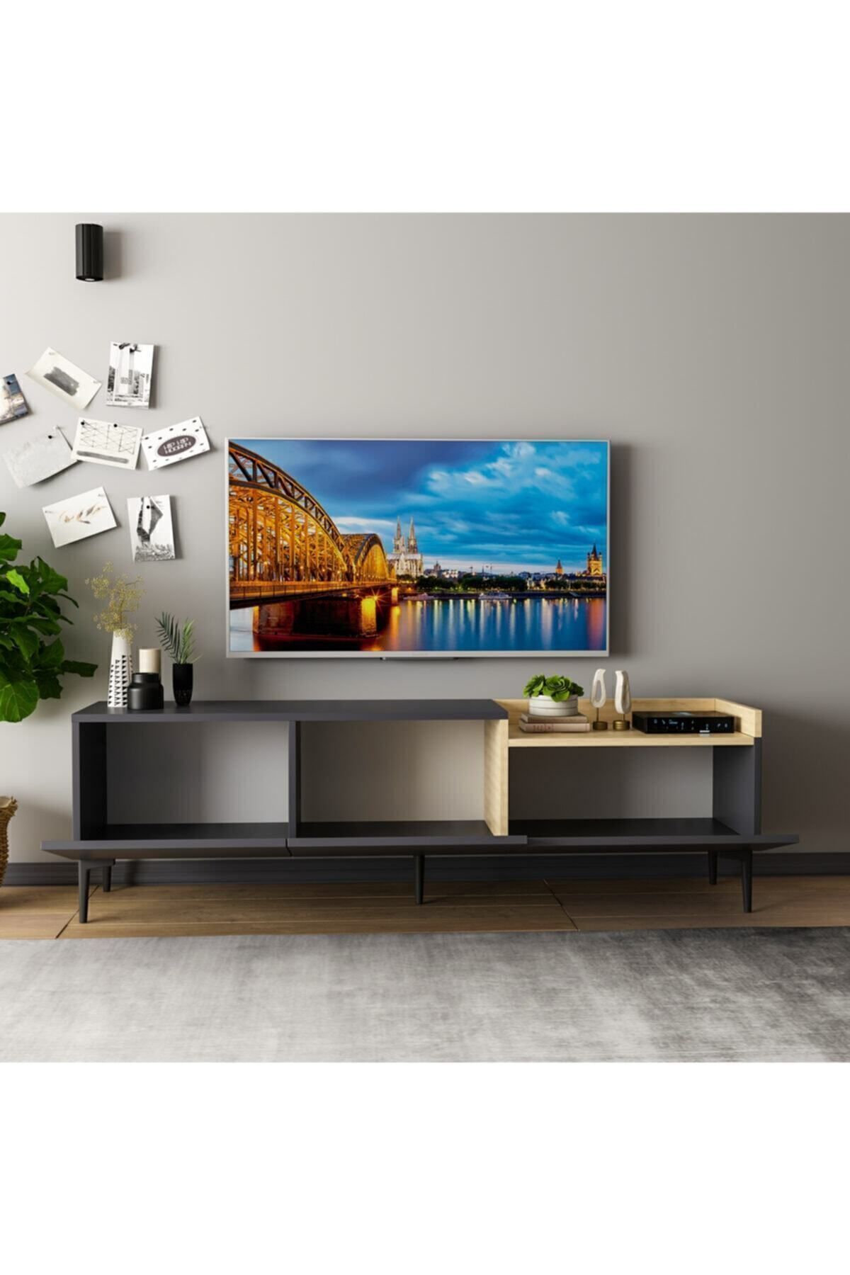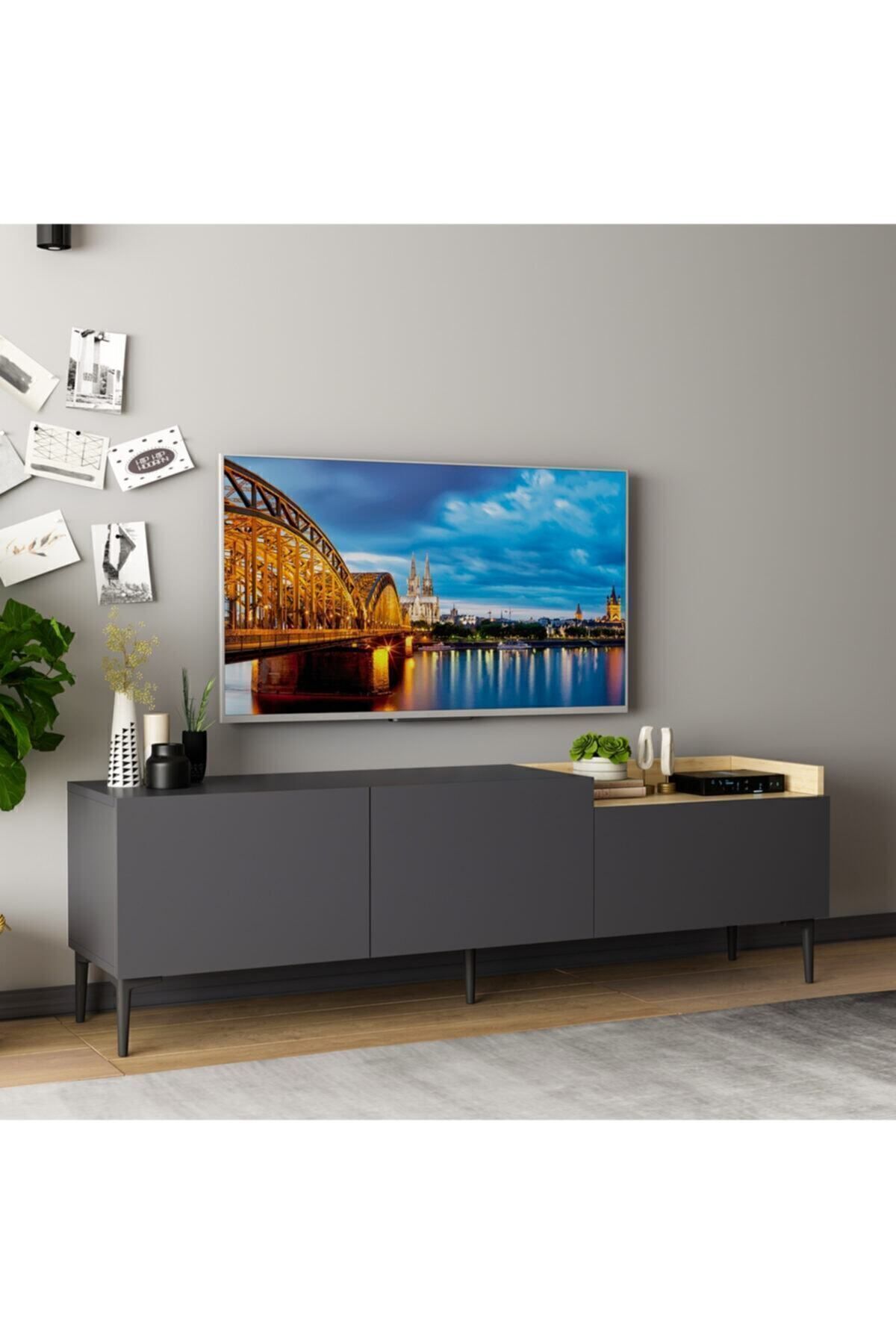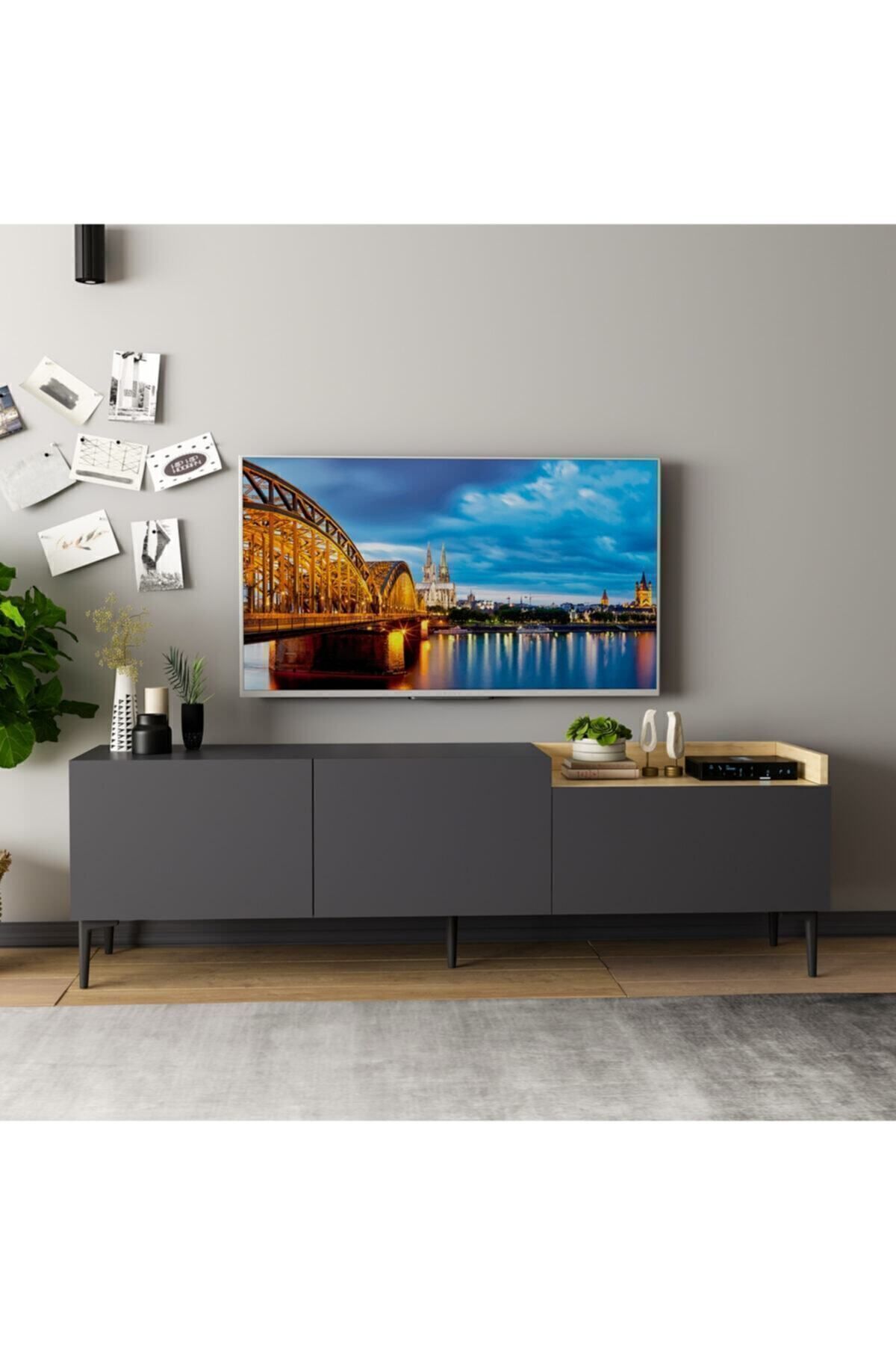 Mia TV Sehpası, modern ve sade tasarımı ile yaşam alanlarınıza şıklık katar. 160 cm genişliğiyle büyük ekran televizyonlar için ideal olan bu model, antrasit gövdeye eklenen doğal ahşap detaylı bölmesiyle dikkat çeker. Metal ayakları sayesinde sağlam ve uzun ömürlü bir kullanım sunar.