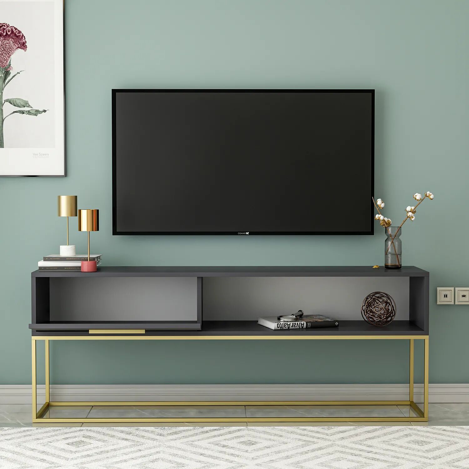 Ürünün üst kısmı 55-65 inç arası TV'ler için uygundur. Alt raf ve kapaklı bölme; kitap, medya oynatıcı, kumanda ve dekoratif eşyalar için ideal bir düzen sunar.