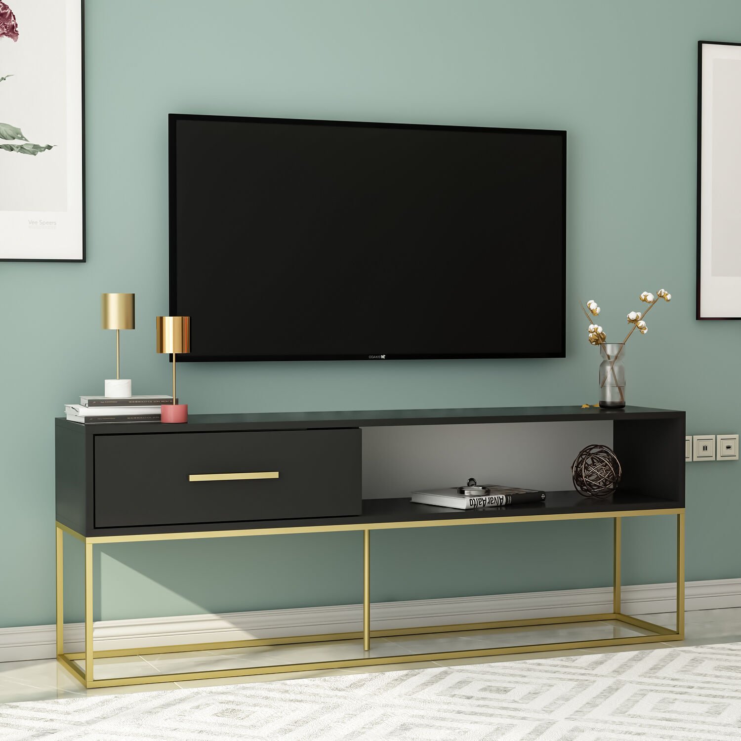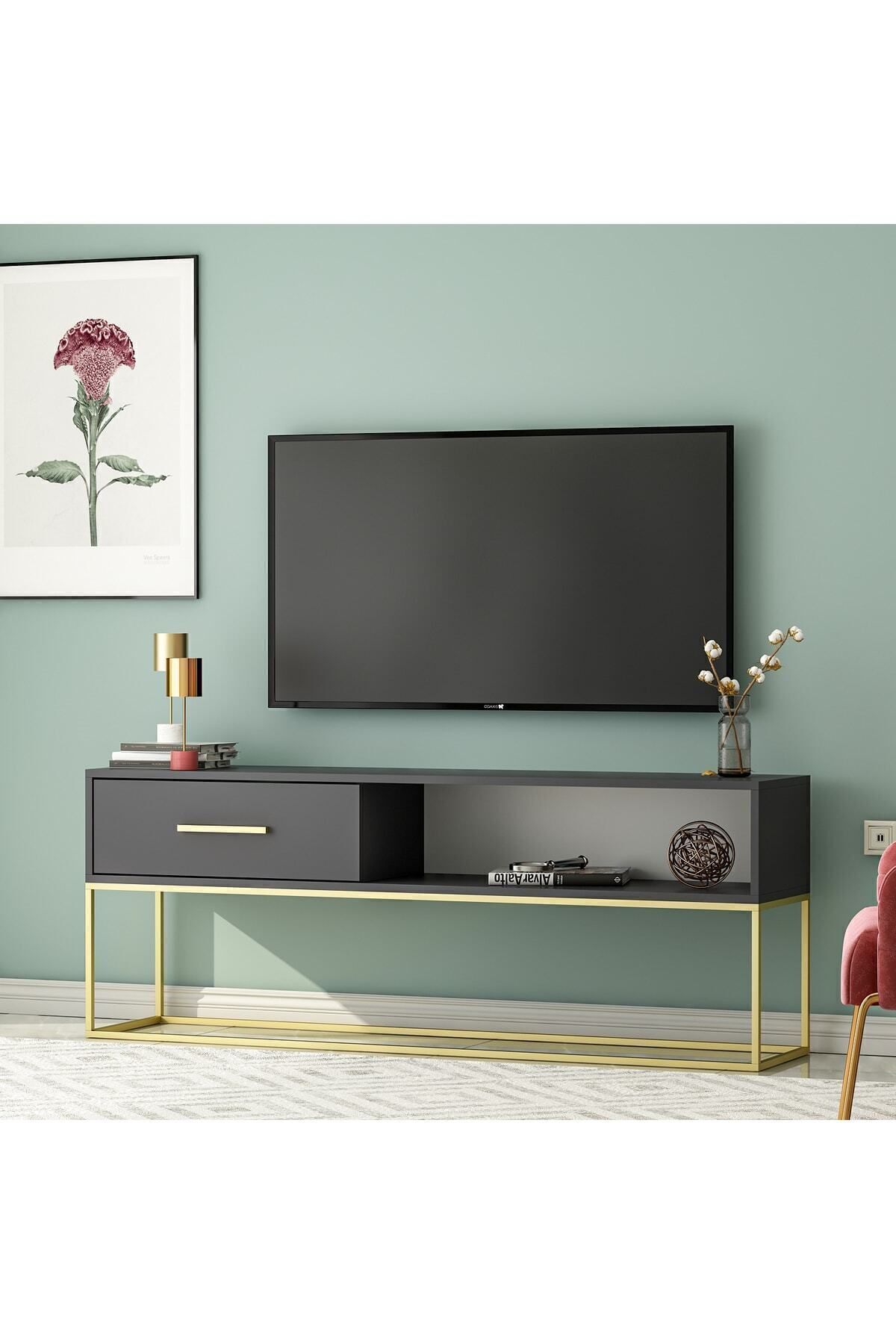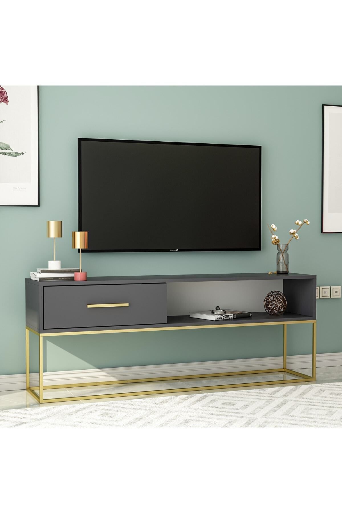 Gold Ayaklı Modern TV Sehpası, şıklığı ve işlevselliği bir araya getiren özel bir tasarımdır. Altın metal ayaklarıyla öne çıkan bu ünitenin geniş depolama alanı ve sade formu, modern ve zarif dekorasyon sevenler için idealdir.