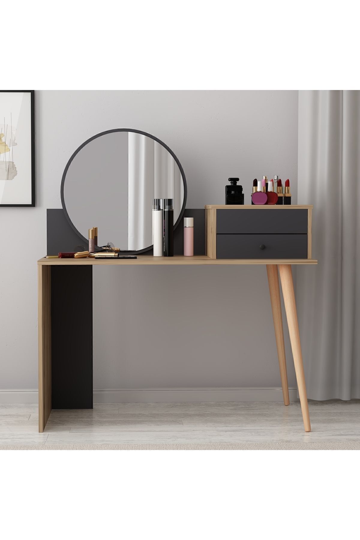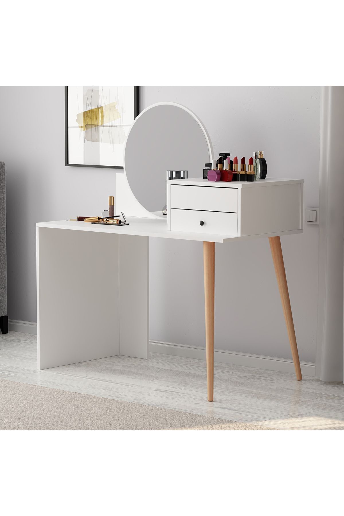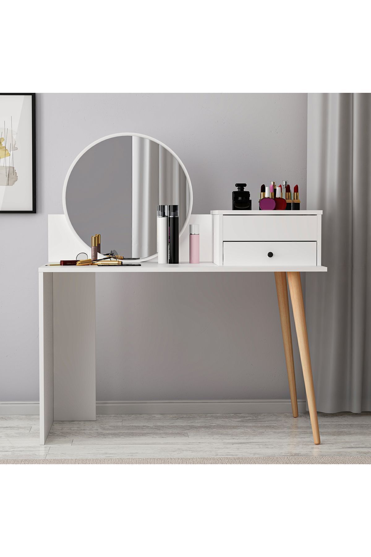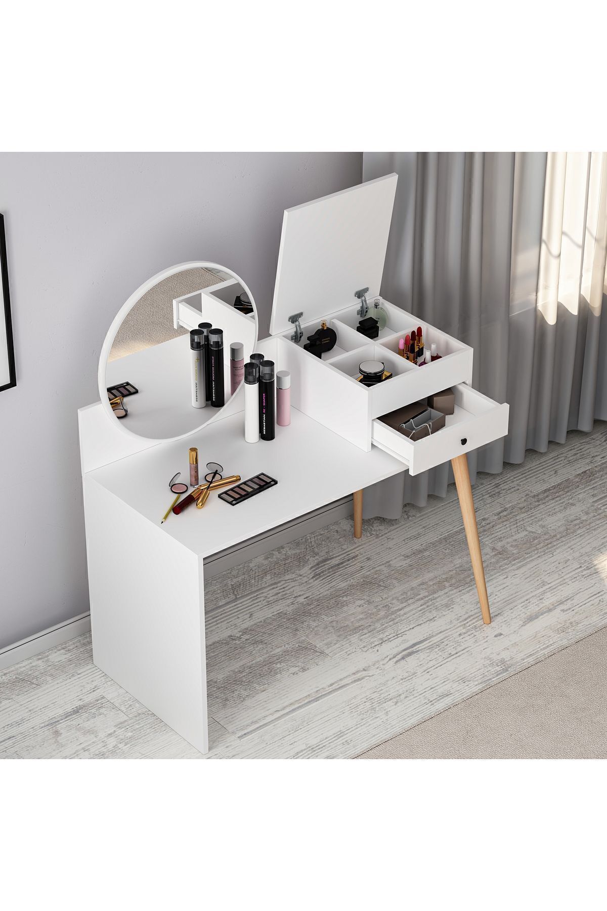 Yuvarlak aynası, geniş masa yüzeyi, çekmecesi ve kapaklı gizli bölmeleri ile tüm makyaj malzemelerinizi düzenli bir şekilde saklamanızı sağlar.