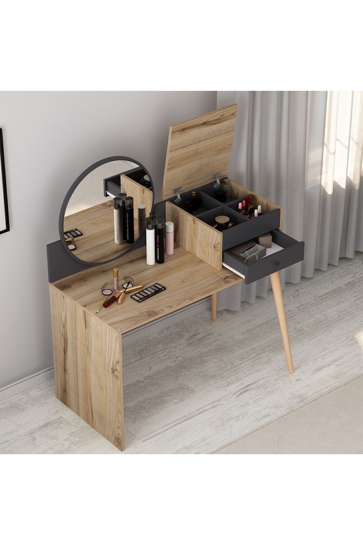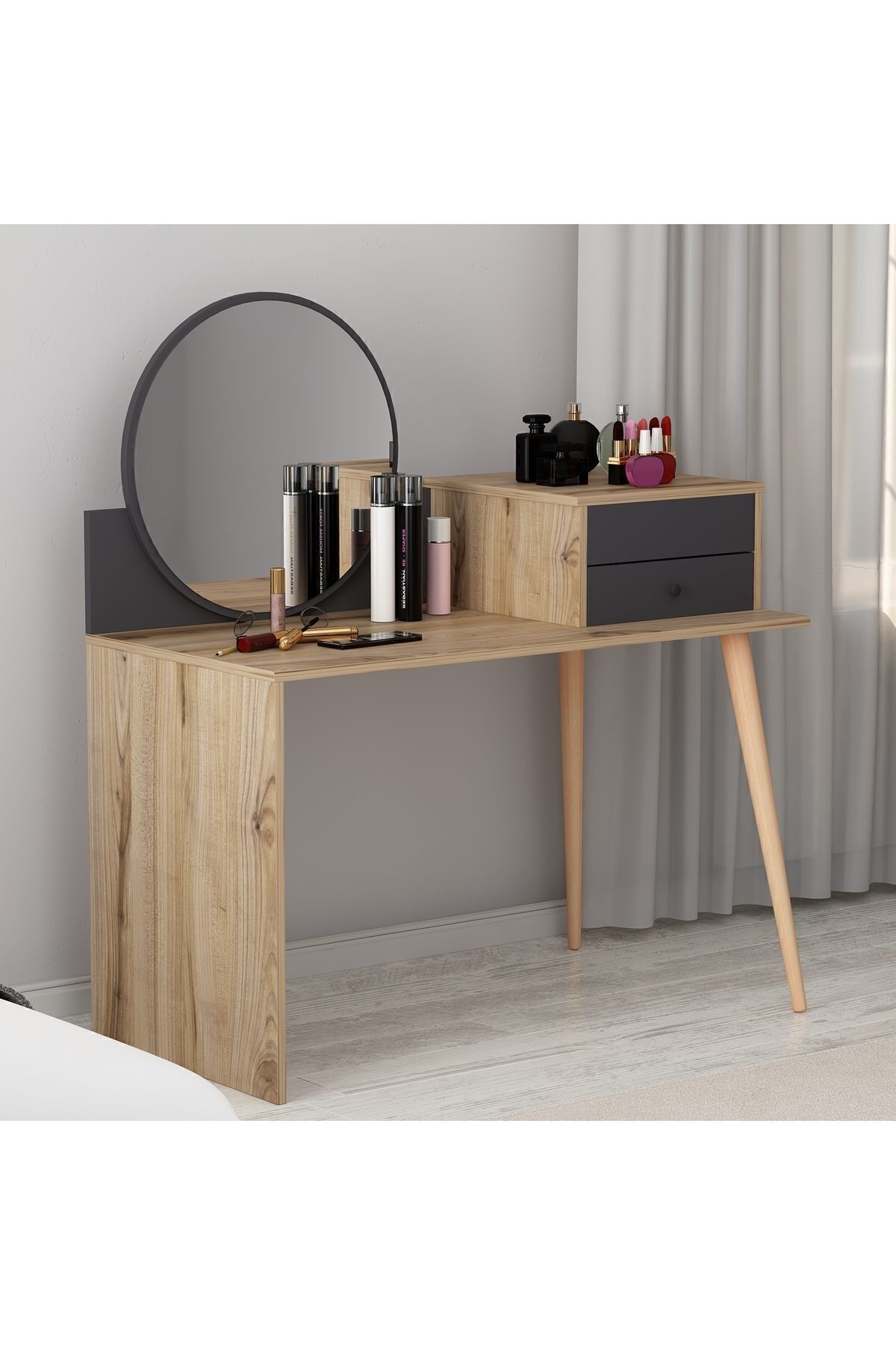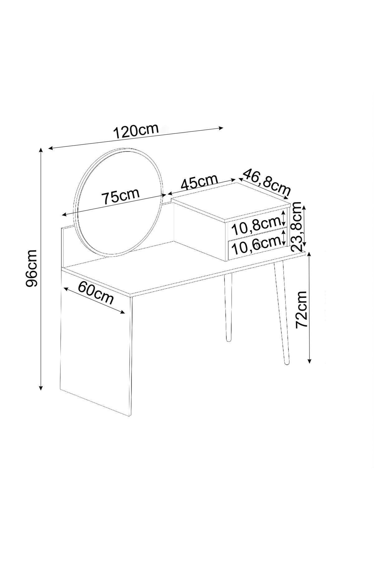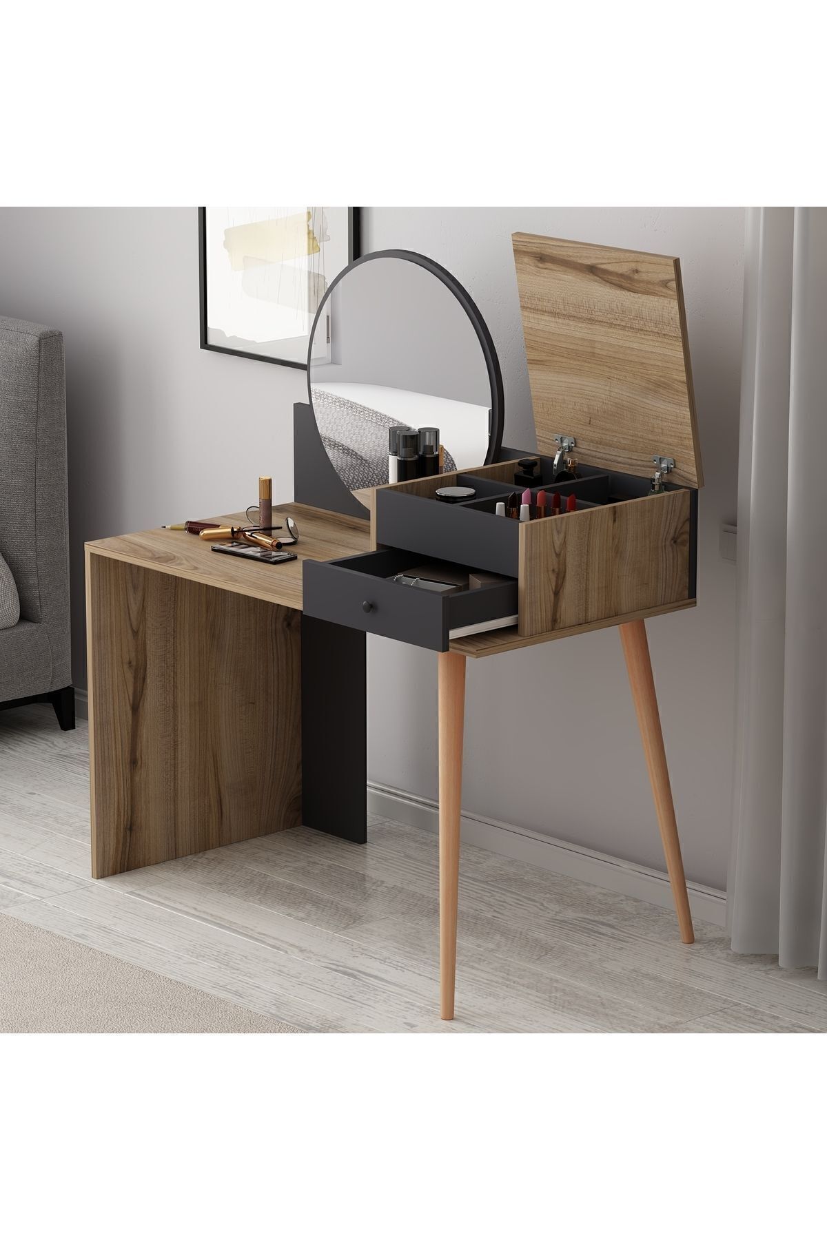 Yuvarlak aynası, geniş masa yüzeyi, çekmecesi ve kapaklı gizli bölmeleri ile tüm makyaj malzemelerinizi düzenli bir şekilde saklamanızı sağlar.