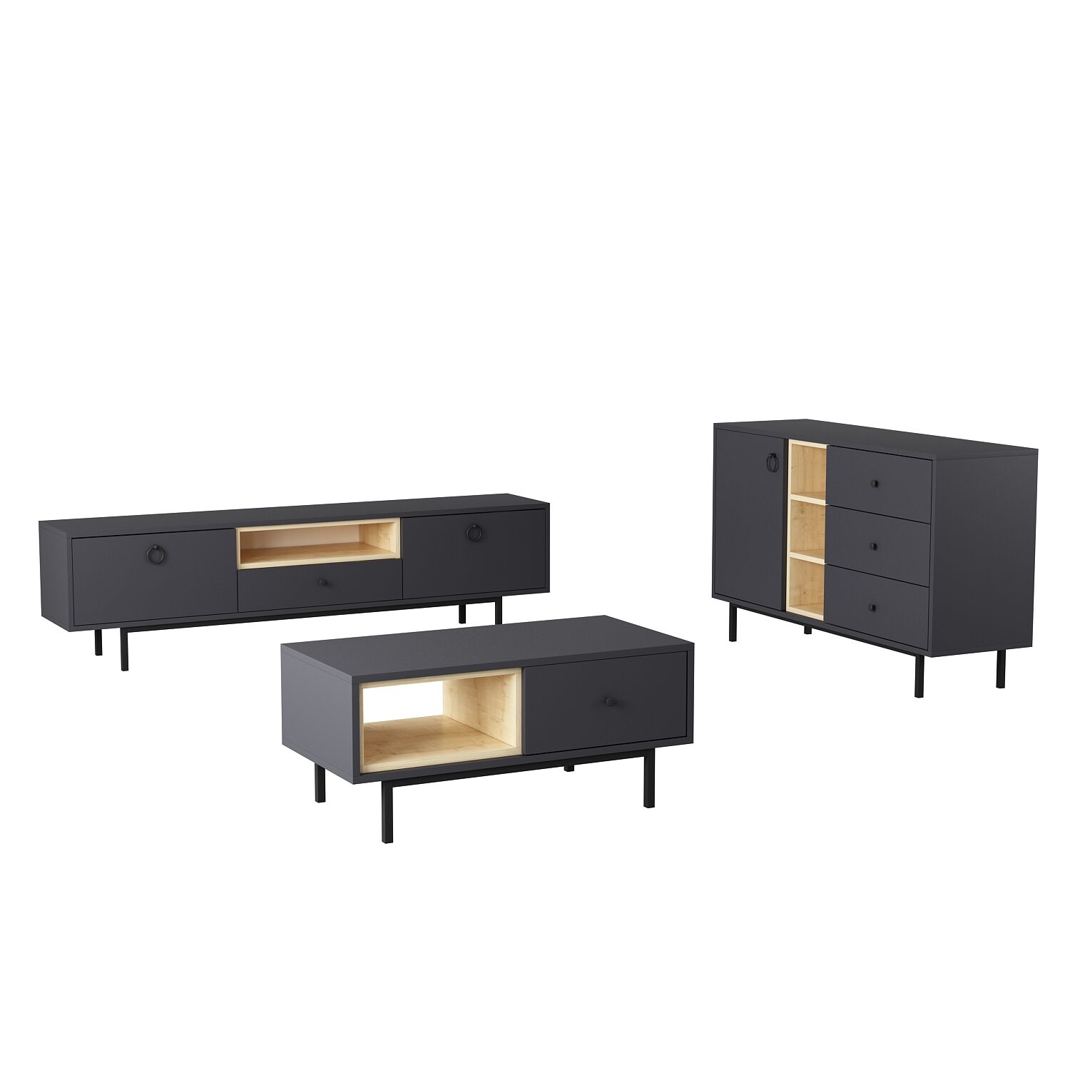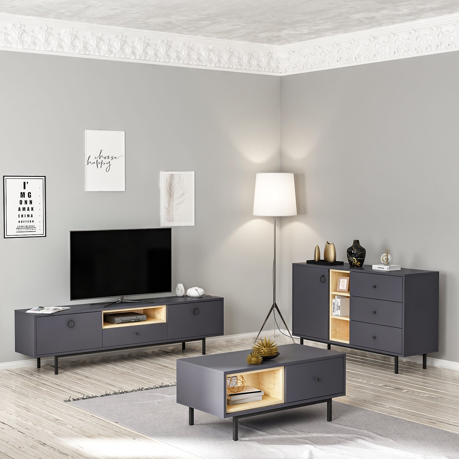 Minimal ayak yapısı ve kontrast iç raf tasarımı ile dikkat çeken bu takım, antrasit ve doğal ahşap tonlarının uyumu sayesinde her dekorasyon stiline rahatlıkla uyum sağlar. Raflı bölümler hem dekoratif objeler hem de kitap, kumanda gibi günlük eşyalarınız için idealdir.