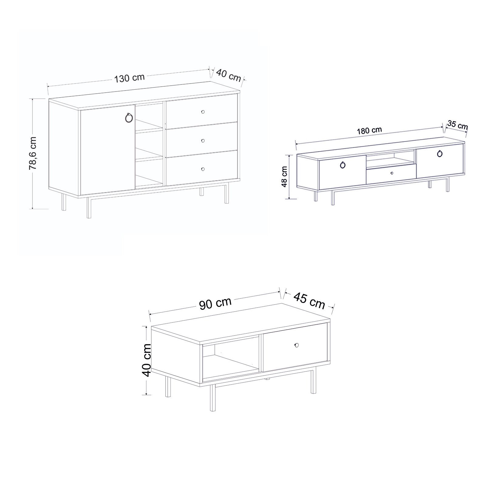 Naturel 3’lü salon mobilya takımı; modern çizgileri, sıcak meşe detayları ve fonksiyonel tasarımıyla yaşam alanlarınıza estetik ve kullanım kolaylığı kazandırır. Set içerisinde 3 kapaklı şık bir TV ünitesi, 1 kapaklı ve raflı orta sehpa ile 1 kapaklı ve 3 çekmeceli fonksiyonel konsol bulunmaktadır.