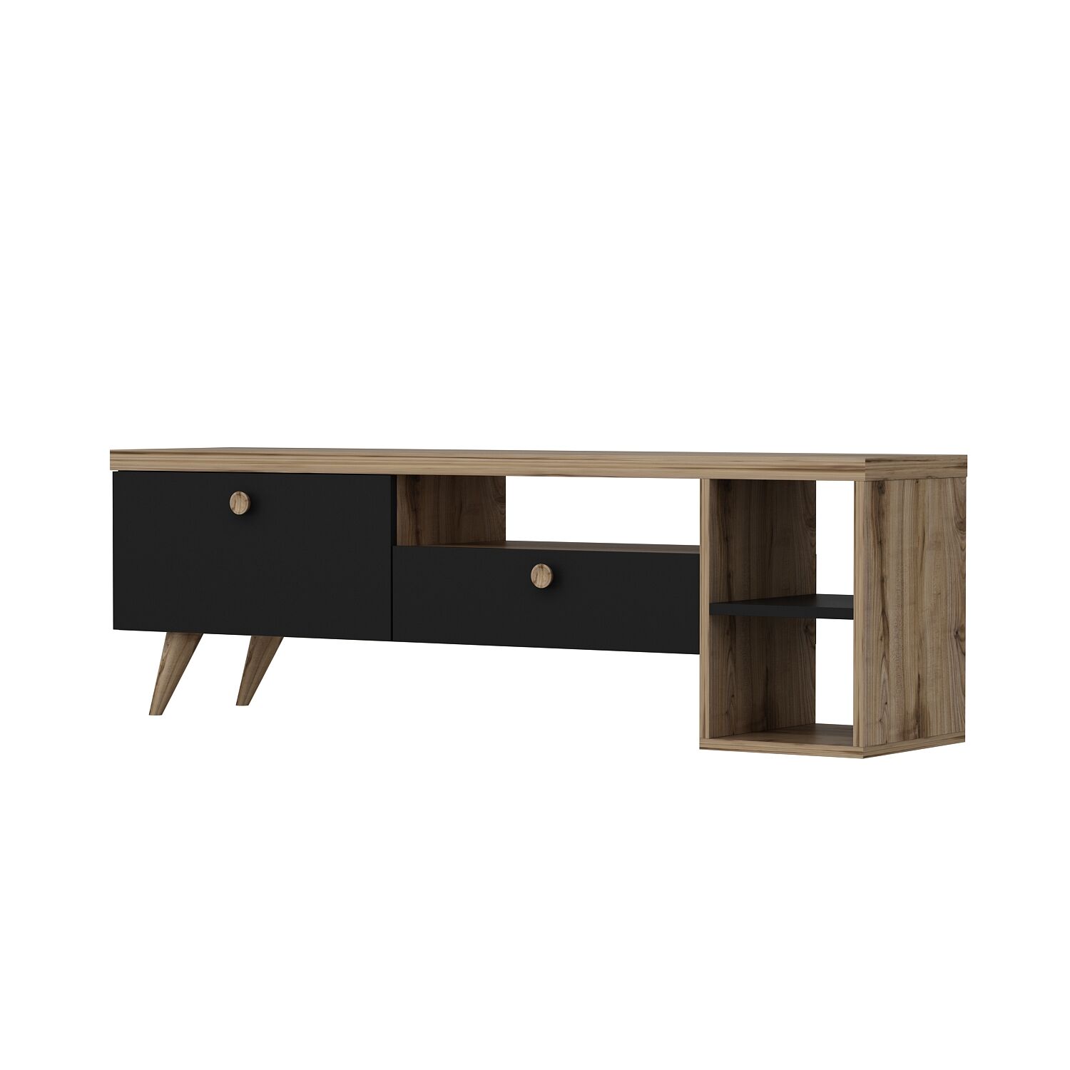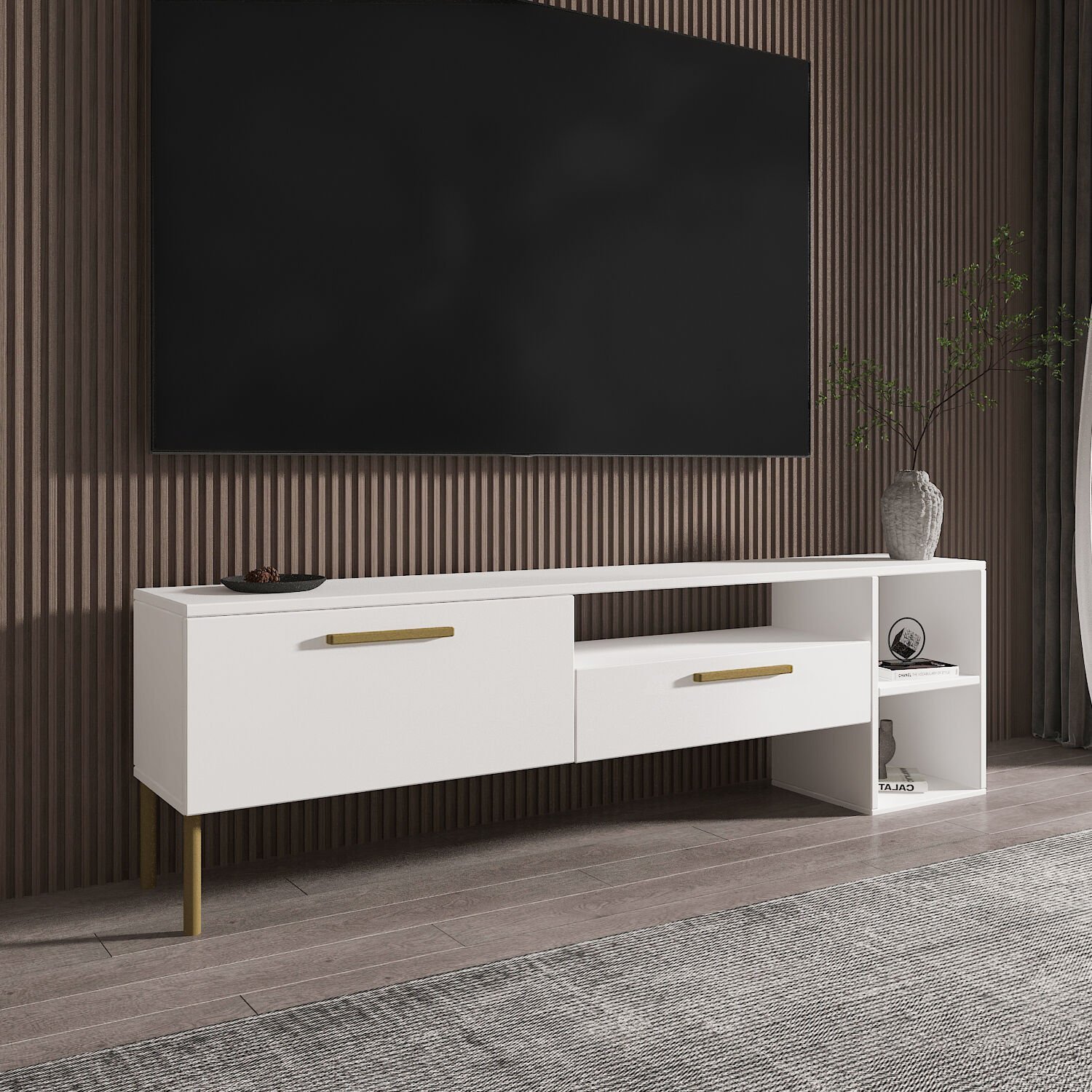 Alt kısmında yer alan 2 adet geniş kapaklı bölme, DVD oynatıcı, oyun konsolu ya da diğer elektronik cihazlarınız için uygun alan sunarken; sağdaki açık raf bölmesi dekoratif objeler, kitaplar ya da medya kutuları için ekstra saklama alanı sağlar. Gold kulplar ve ayak detayları ürüne zarafet katarken, yüksek ayakları sayesinde temizlik kolaylığı da sunar.