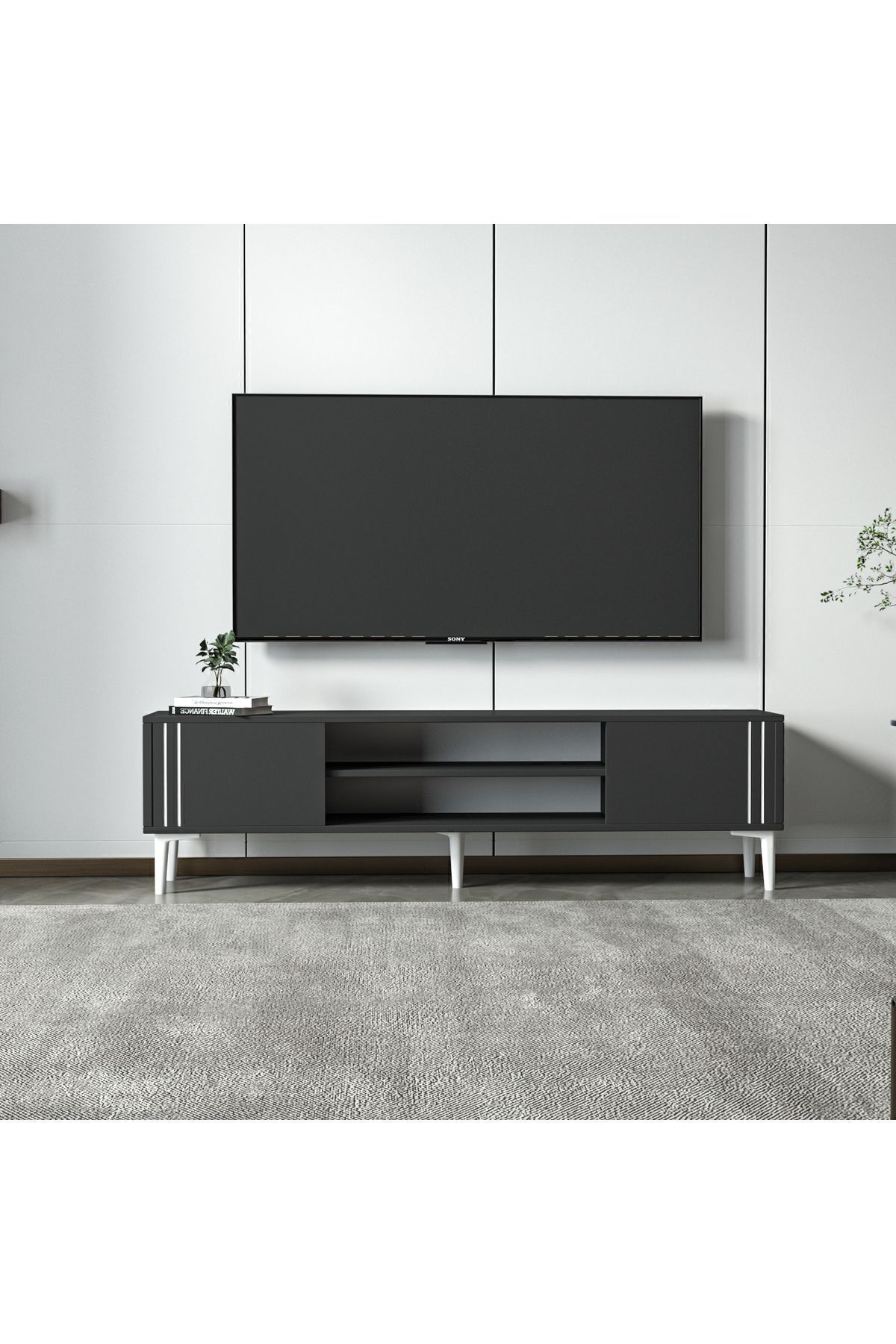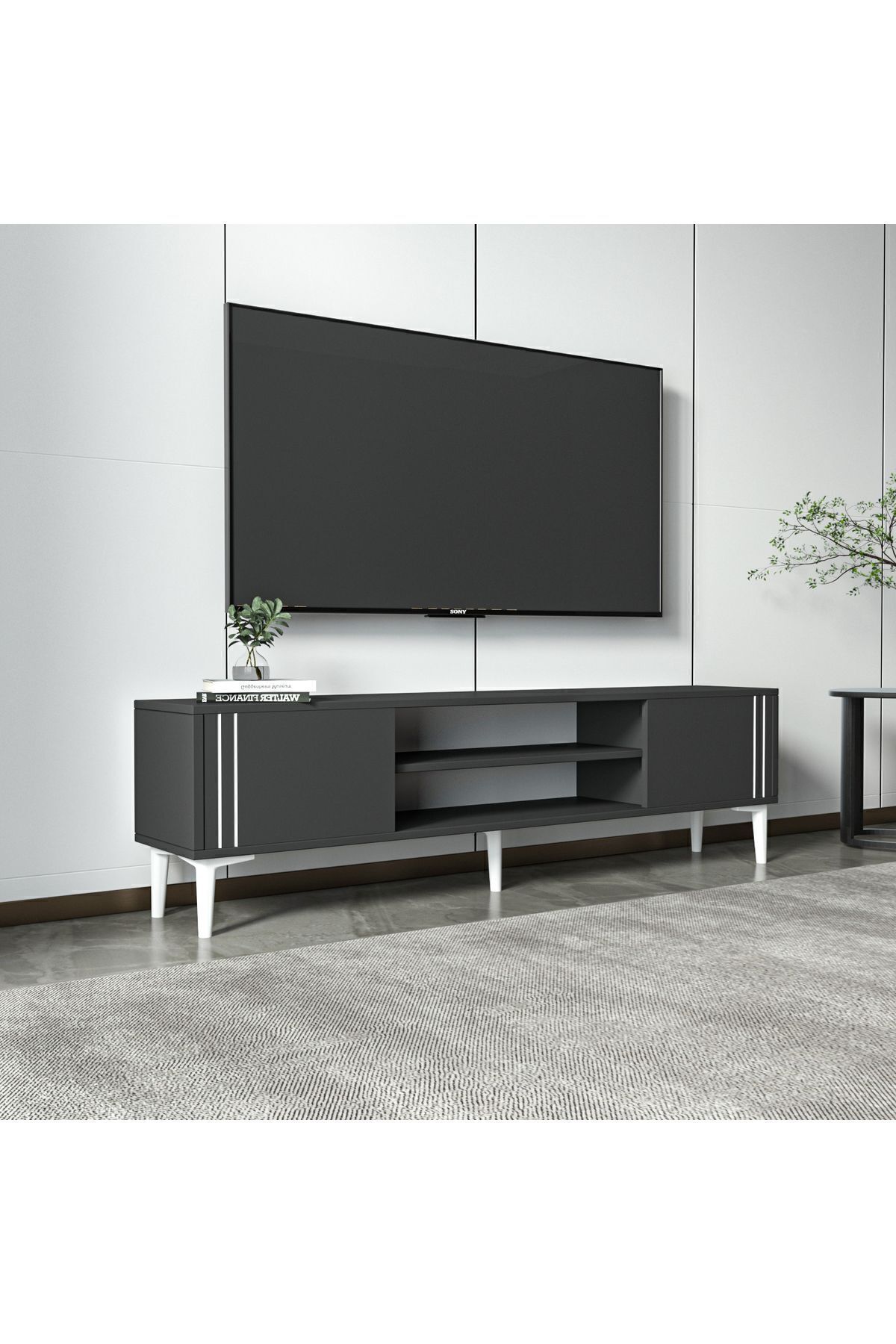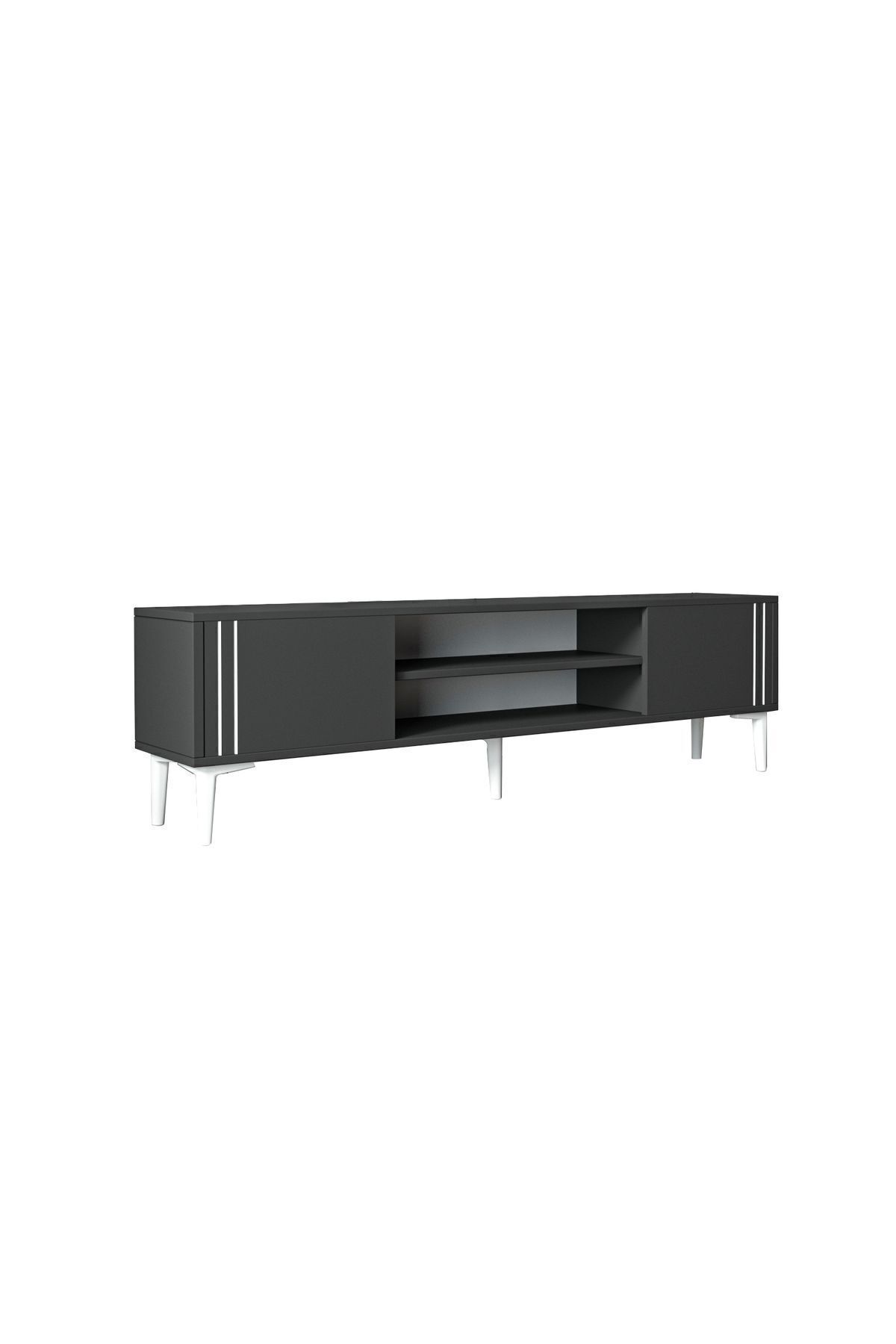 İki kapaklı dolap alanı ve geniş açık raflarıyla medya ekipmanlarınızı, kitaplarınızı ve dekoratif objelerinizi düzenli bir şekilde sergileyebilirsiniz. Dayanıklı 18 mm melamin kaplı yonga levhadan üretilmiş olup, E1 sertifikalı çevre dostu yapısıyla uzun ömürlü ve sağlıklı bir kullanım sunar.