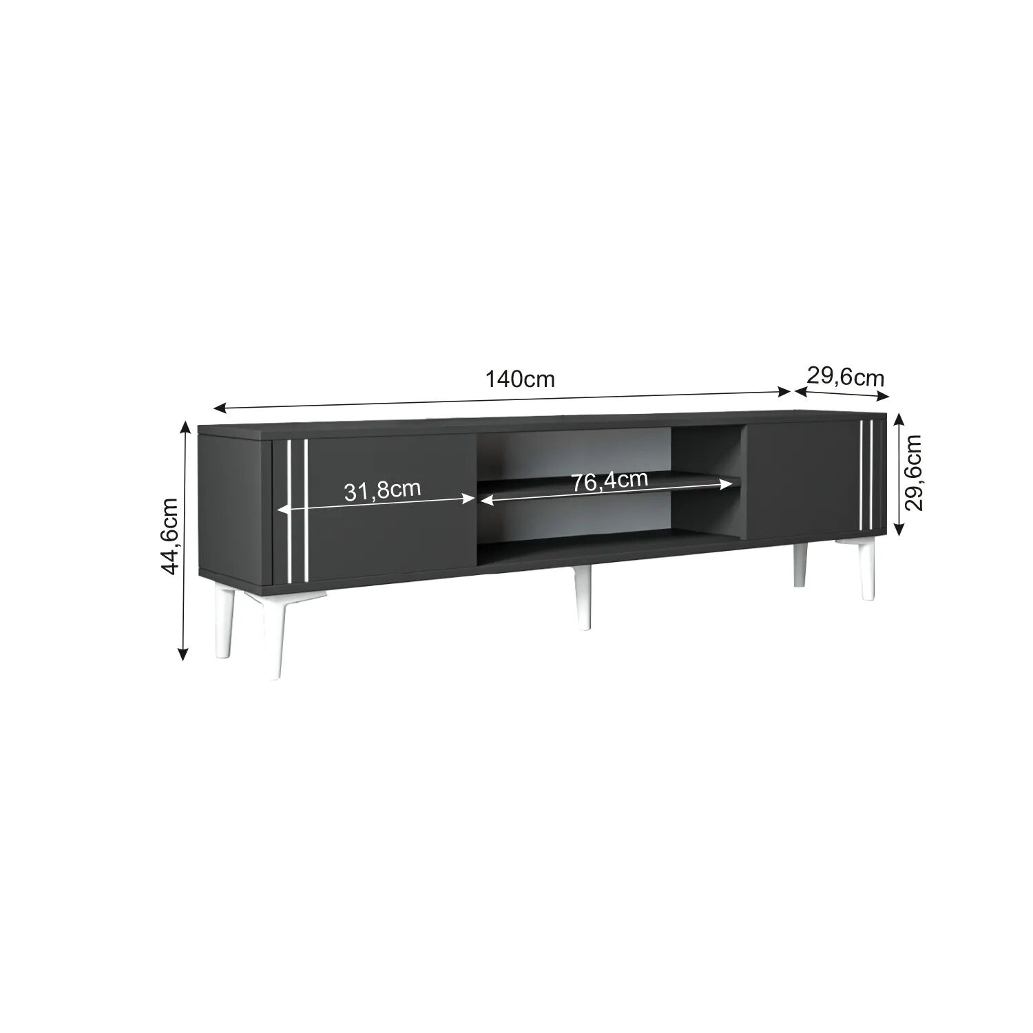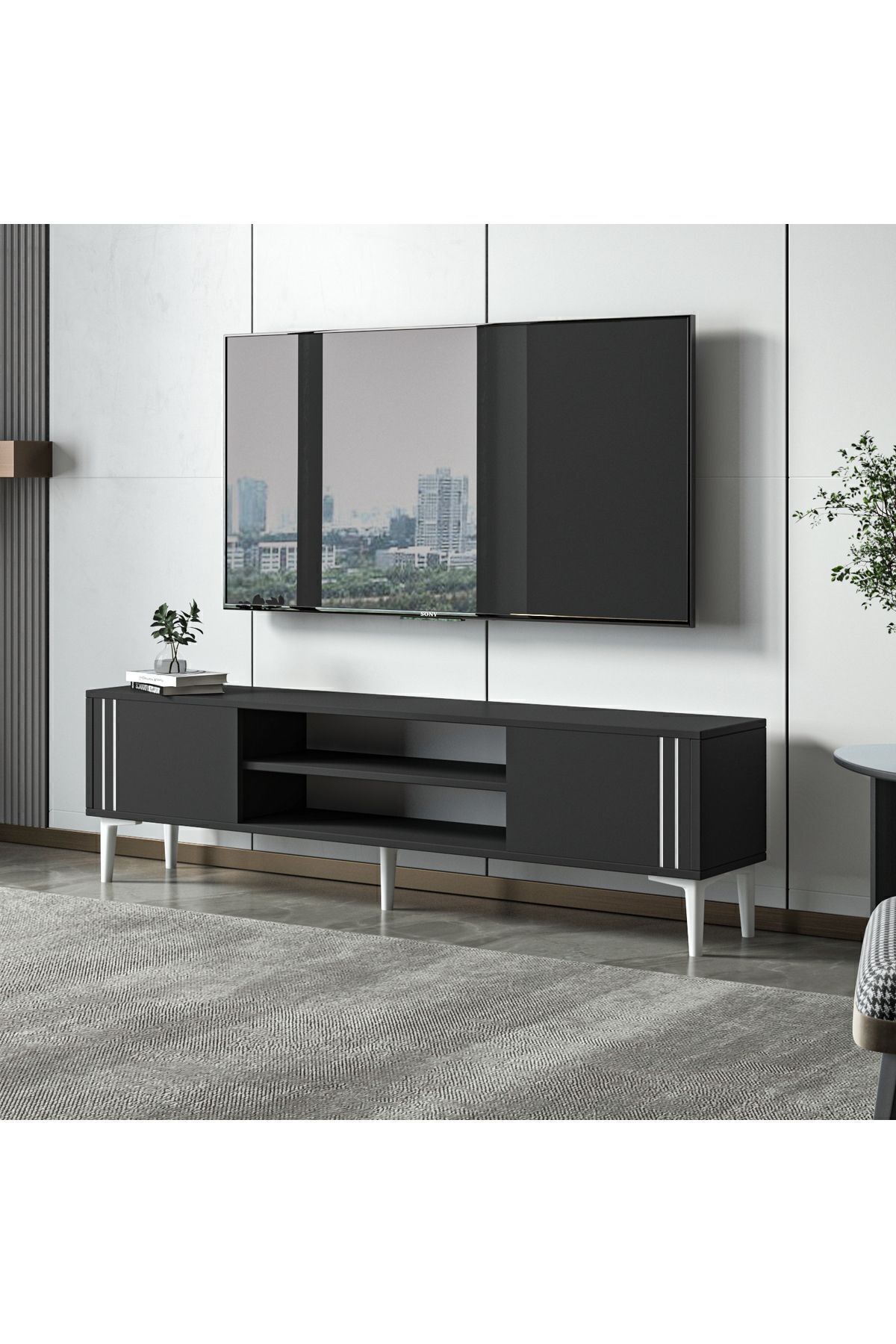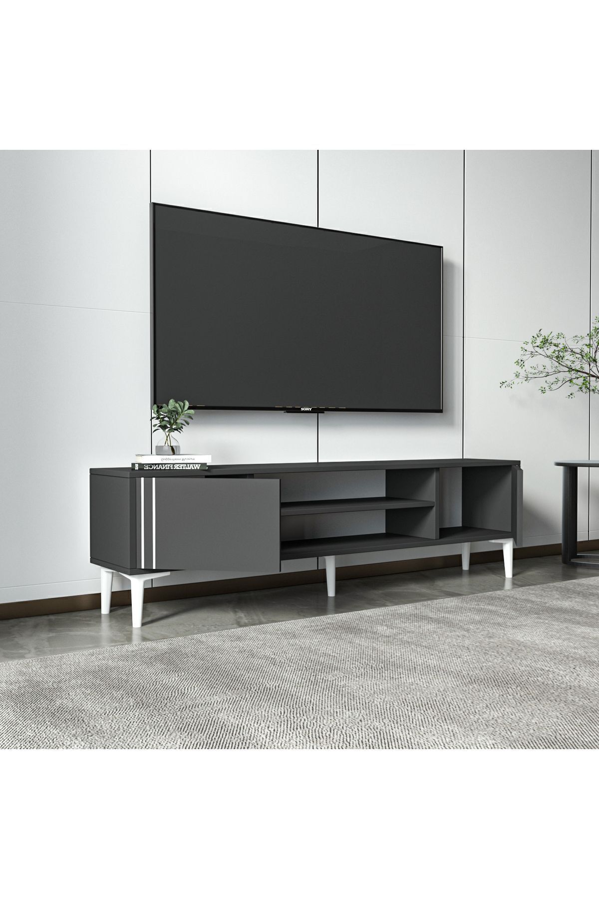 İki kapaklı dolap alanı ve geniş açık raflarıyla medya ekipmanlarınızı, kitaplarınızı ve dekoratif objelerinizi düzenli bir şekilde sergileyebilirsiniz. Dayanıklı 18 mm melamin kaplı yonga levhadan üretilmiş olup, E1 sertifikalı çevre dostu yapısıyla uzun ömürlü ve sağlıklı bir kullanım sunar.