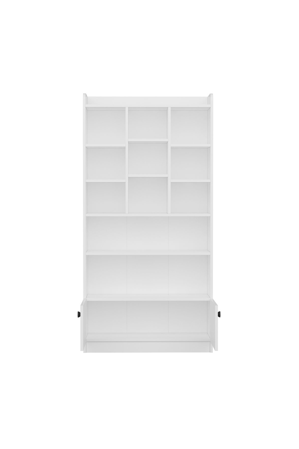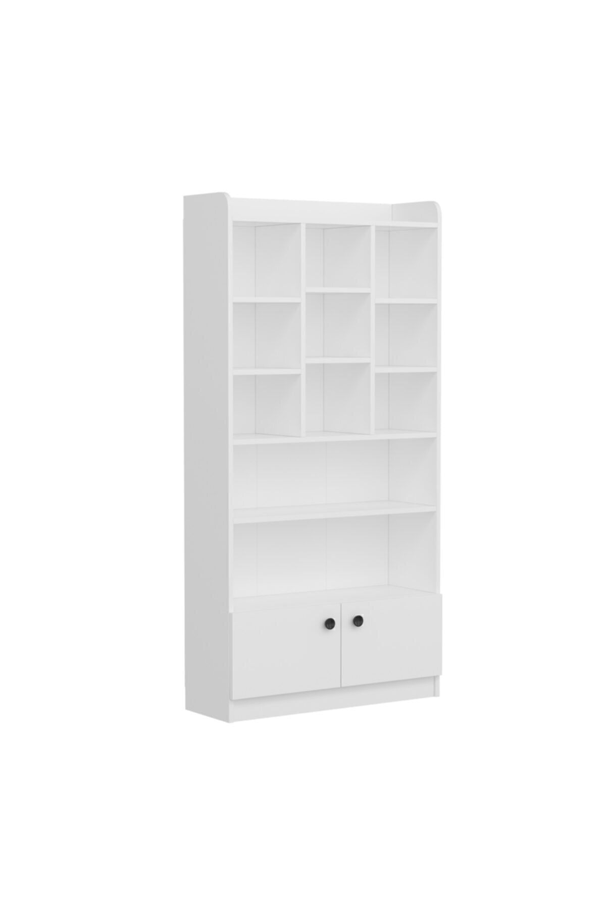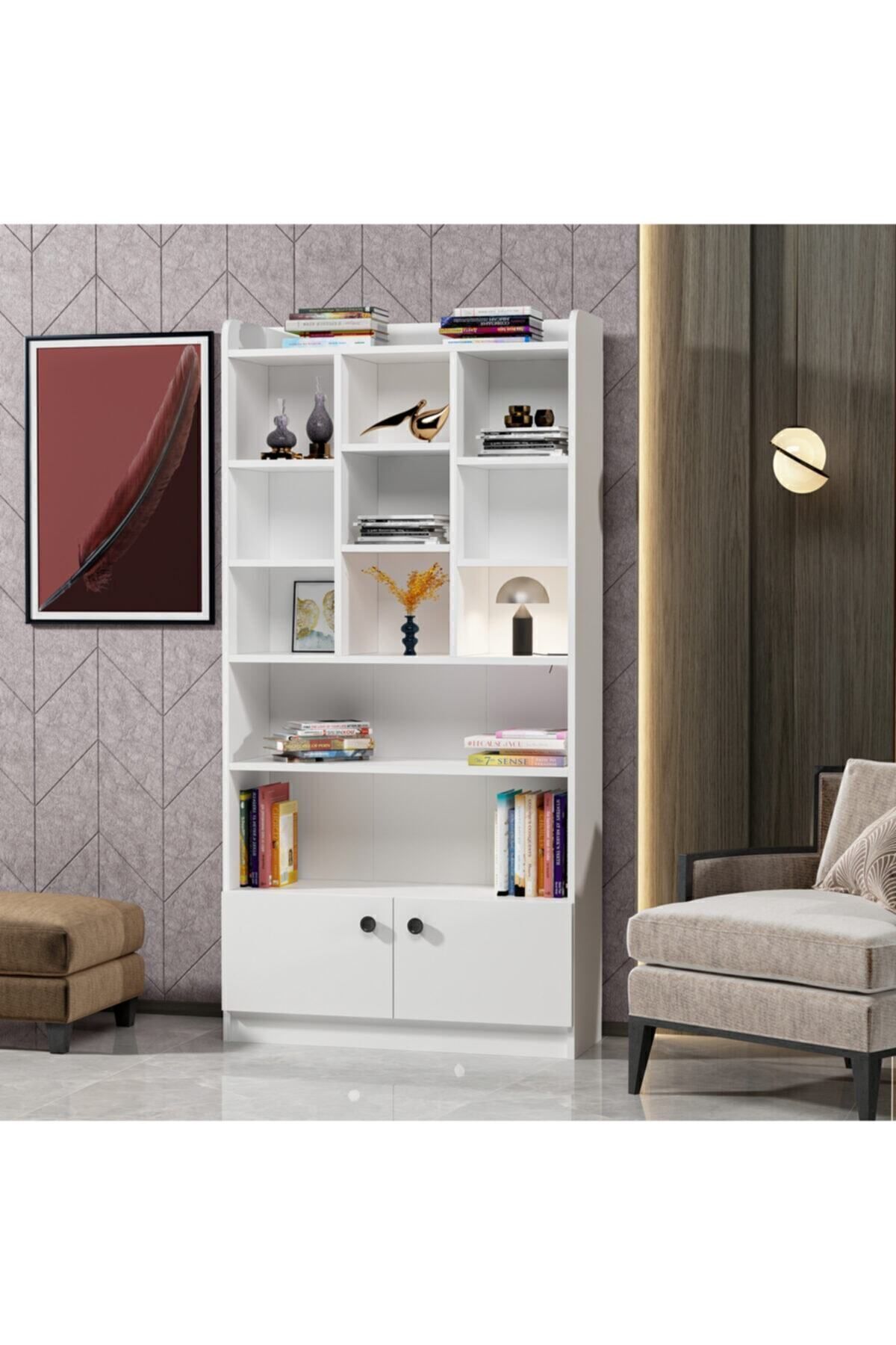 Ürünün üst bölümünde açık raflar, alt kısmında ise çift kapaklı geniş bir dolap alanı bulunur. Raf düzeni sayesinde hem estetik hem de kullanım açısından oldukça pratiktir. Parlak beyaz rengi, tüm dekorasyon stilleriyle kolayca uyum sağlar.