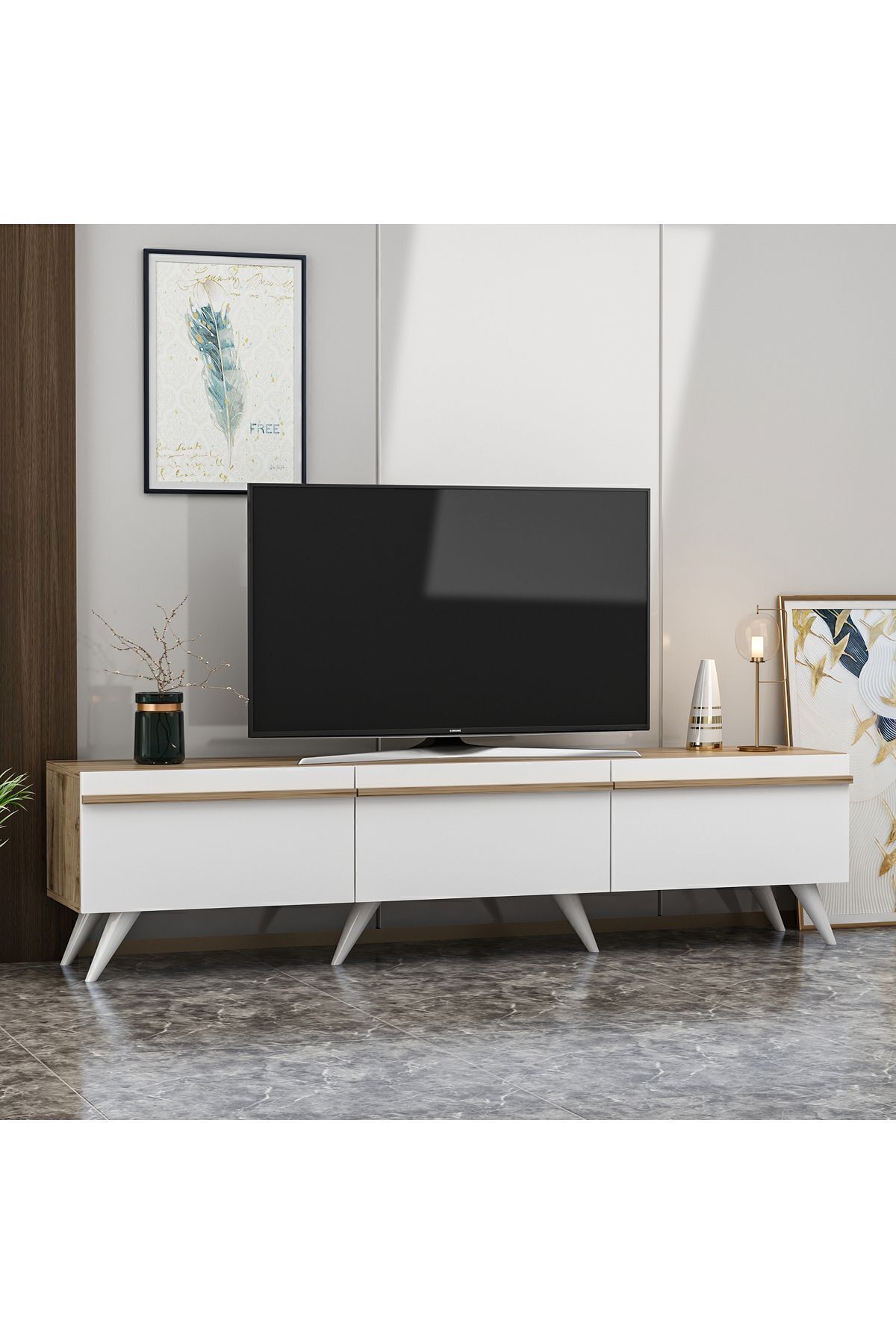 Üç ayrı bölmeden oluşan kapaklı dolapları sayesinde kablo, kumanda ve diğer eşyalar için düzenli saklama alanı sunar. Şıklığı kadar işlevselliğiyle de dikkat çeken Valentina, salon, oturma odası veya TV köşelerinde modern bir atmosfer yaratmak isteyenler için mükemmel bir tercihtir.